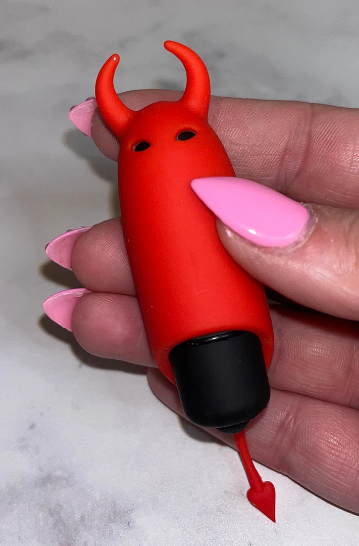 Mini Devil Bullet Vibrator is a cute little demon with mega vibrations for that bad girl inside of all of us. Small enough to throw in you pocket, he is the perfect little devil for on the go. Made from smooth premium silicone. His forked tail and horns create vibrations and pleasure that only the devil could cause! Simple one click button turns him on and off. Take three LR44 batteries (included) 10 vibration modes. Whisper quiet. Waterproof and Phthalates Free