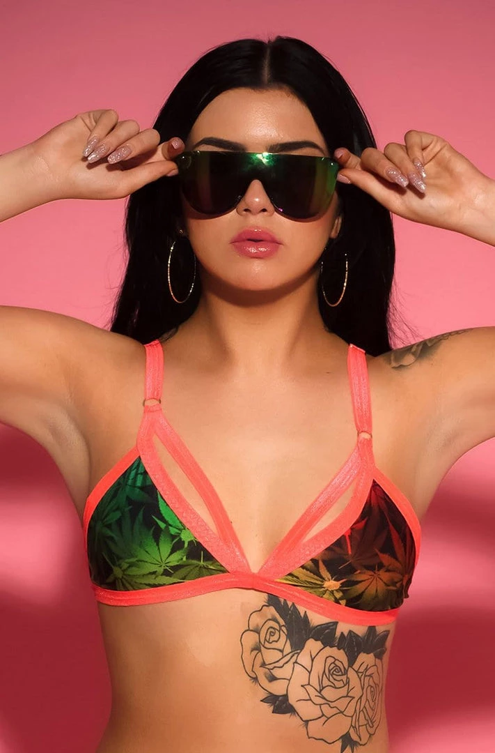 Live the high life and just relax in this weed printed cage bralette with cage elastic details to show off that sexy skin.This bra has adjustable straps and the band hooks at the back for easy on/off access.Â
