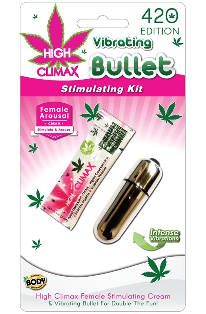 High Climax Female Stimulating Cream And Bullet set comes with a small size of the best selling High Climax arousal cream. Use a small amount to increase female arousal and maximize sensation. And to increase the fun comes with a mini bullet vibrator. Great gift for any stoner in your life or any woman looking to enhance pleasure.
