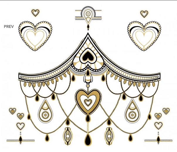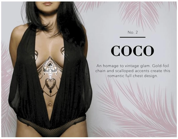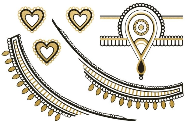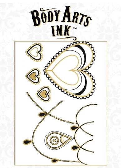 Body Arts Ink Coco Chest Body Tattoo jewelry inspired gold temporary tattoo that can be worn anywhere. These luxury fashion temporary tattoo collections include various alluring styles. These enticing designs give you a variety of possibilities- transforming your entire look into gold. Similar to the flash tats seen on celebs such as Beyonce, the gleaming body tattoos are sure to turn heads with their light catching effects. Perfect for the beach, the pool, parties, festivals, concerts: anywhere you might want to glow. These ornate temporary tattoos are exotic but always non-toxic and safe for all fashionistas to wear. Each applied piece lasts for up to 5 days, even through showering and swimming. Includes 4 sheets of art.