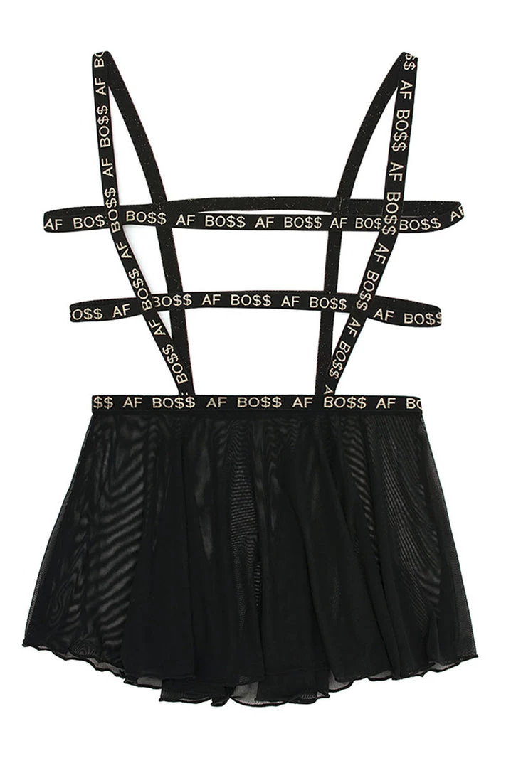 Sheer mesh suspender skirt with “Boss AF” elastic strap cage detail. Bra sold separatelyÂ