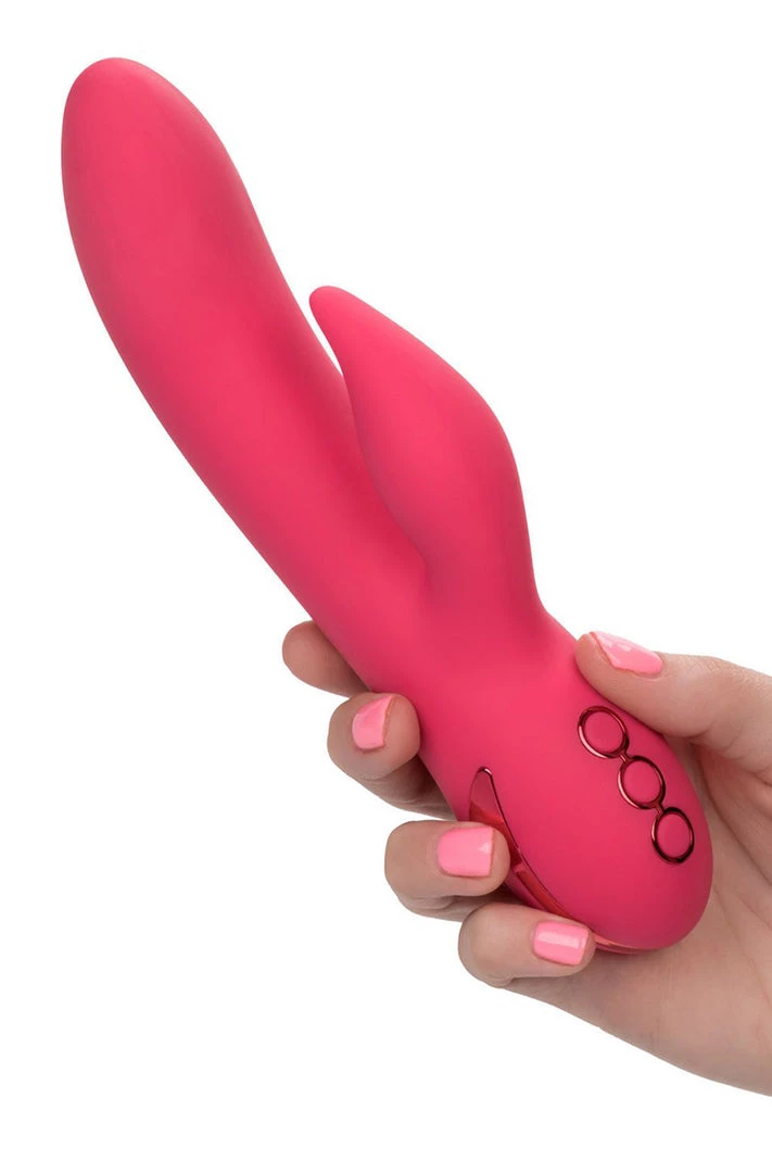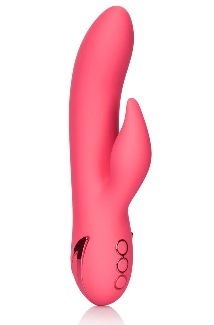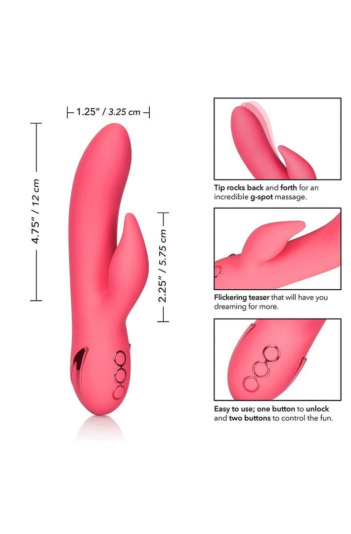 California Dreaming San Francisco Sweetheart Pink Rabbit Style Vibrator. Dive deep into pools of pleasure and sun kissed fantasies with the playful California Dreaming San Francisco Sweetheart. The luxurious vibrating massager has 10 intense vibration functions and 3 back and forth G-spot massager speeds for one of a kind pleasure experience. The seamless silicone body and flickering teaser put out knee shaking stimulation in and out of the water. Whether you are looking to turn up the heat with a lover or just enjoy some sensual solo time, this ravishing rabbit is ready. While the curved tip rocks back and forth for powerful g-spot massage, the soft, flickering clitoral vibrator delivers blissful external pleasure. Control and customize your pleasure play with the independently controlled vibration massager and rocking functions. Recharge the massager in 2.5 hours with the provided USB charging cable to enjoy 45 minutes of high speed stimulation or 2.5 hours of low speed vibrations. Enjoy frustration free control with the easy touch 3 button control pad and security lock feature for travel ready teasing. The virtually seamless body and self sealing charging port allow you to get this versatile waterproof vibe for a dip. The hypoallergenic premium silicone is body safe, unscented and phthalate free to keep you most sensitive spots, happy and healthy. Color Pink. Materials Silicone, ABS Plastic with Metallic Plating. Power source USB Rechargeable included. Features Phthalate Free, Waterproof, Rechargeable, Vibrates. 1 year warranty. Maximum run time 150 minutes. Maximum charging time 150 minutes. Measurements 4.75 inches by 1.25 inches shaft. 2.25 inches by 1 inch stimulator.