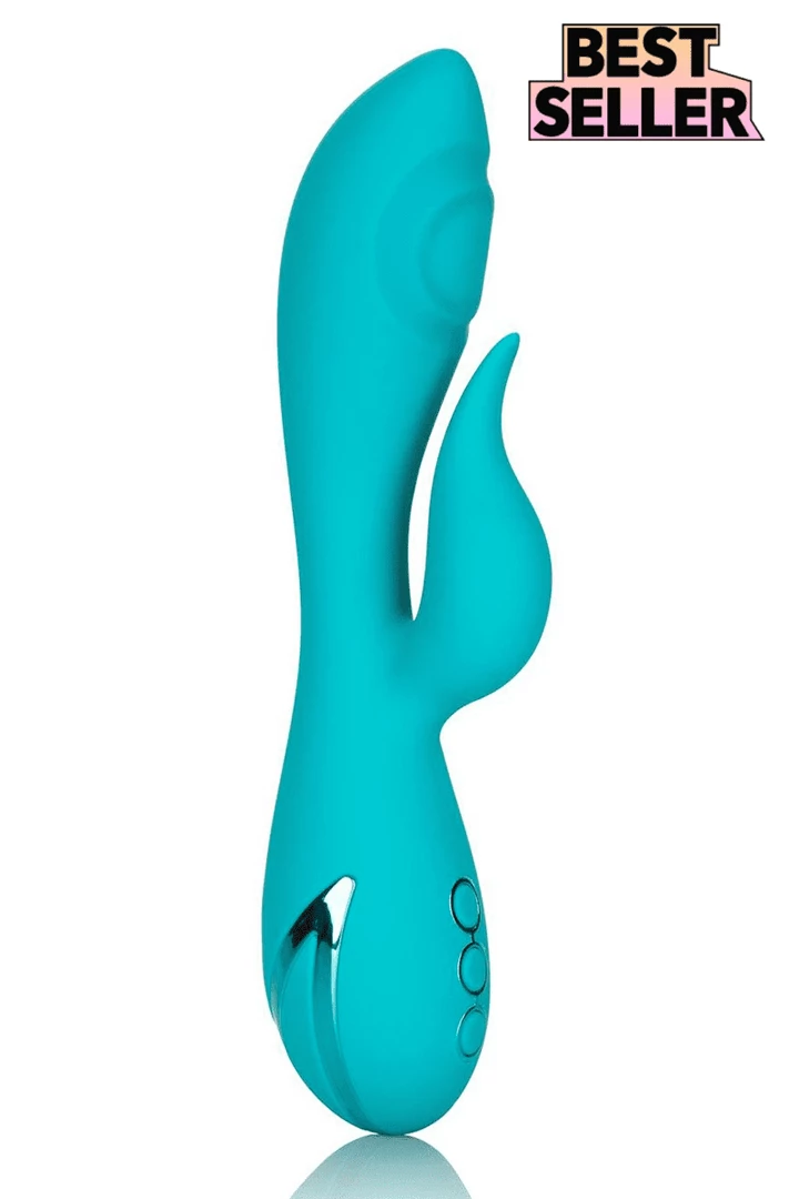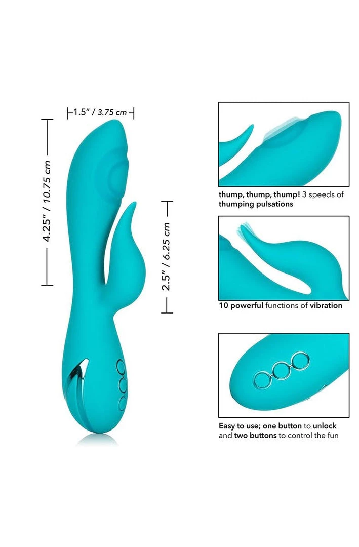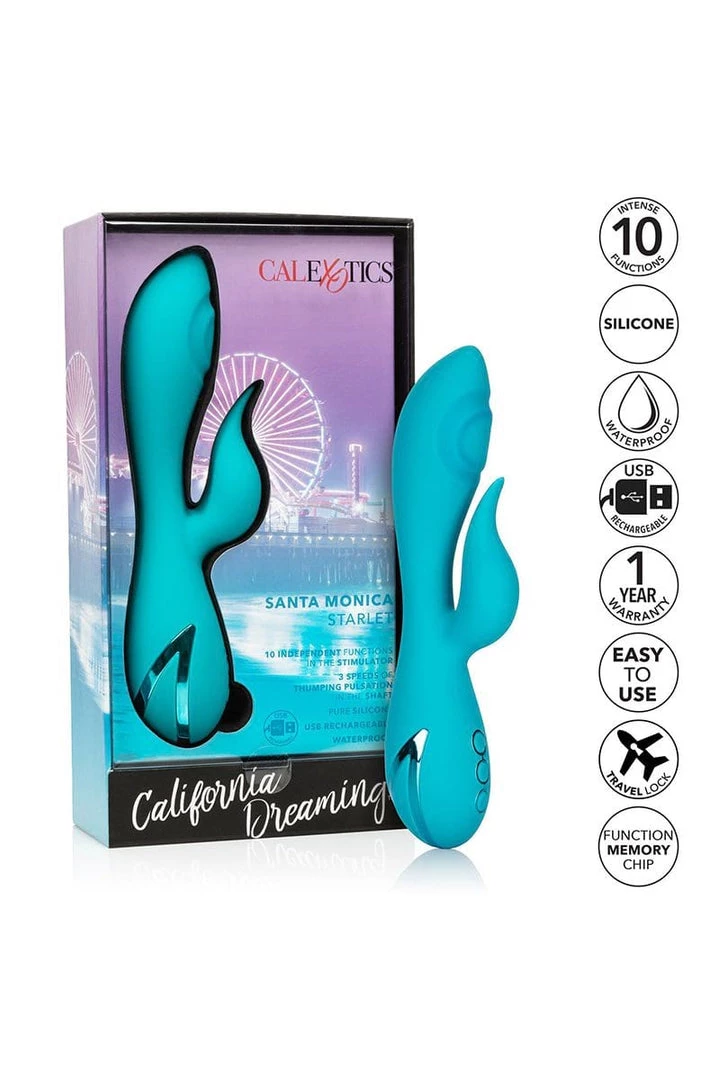 California Dreaming Santa Monica Starlet Blue Rabbit Style Vibrator. The playful California Dreaming Collection brings star studded fantasies to life with the passionate Santa Monica Starlet. The ergonomically designed massager is ready to ready for those A-List fantasies with 10 powerful functions of vibration and 3 knee shaking thumping pulsation speeds. While the flickering stimulator teases, the tapered shaft and curved tip delivers intense thumping stimulation. The curved tip uses a powerful pounding sensation for intense g-spot stimulation. The teasing tickler uses a powerful vibration motor to deliver blissful external stimulation. The flexible teaser can be used independently from the thumping function for fully customized pleasure. Plug the provided USB cable into the self healing charging port to recharge your passion in 2.5 hours. Thrill with up to 150 minutes of vibrating pleasure. To effortlessly control stimulation, the sleek 3 button control pad lets you independently operate the vibration and thumping options. The high tech memory chip remembers just how you like it resumes play on the last function used. Features: Color Blue. Materials Silicone, ABS Plastic with Metallic Plating. Power source USB Rechargeable, included. Phthalate Free, Waterproof, Rechargeable, Vibrates. Allergens N/A. 1 year warranty. Maximum run time 150 minutes. Maximum charge time 150 minutes. Measurements 4.25 inches by 1.5 inches shaft. 2.5 inches by 1 inch clitoral stimulator. Bulk weight 6.1 ounces. Package 16.1 ounces, 2.5 inches by 5.25 inches by 10 inches.