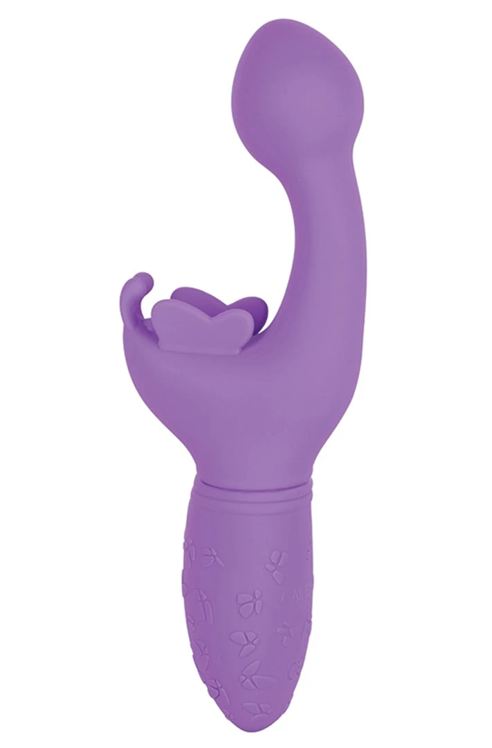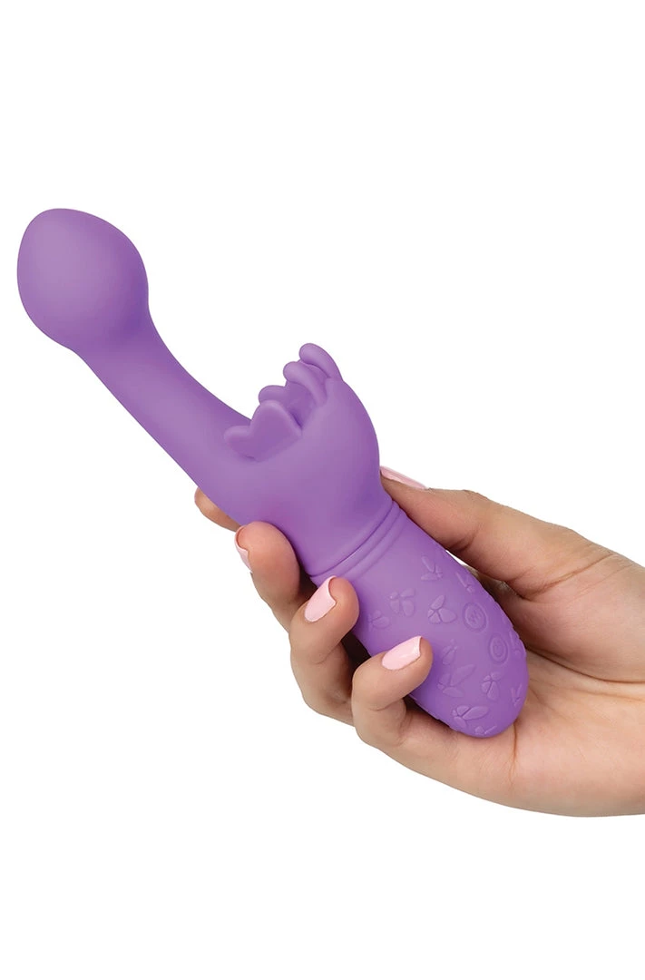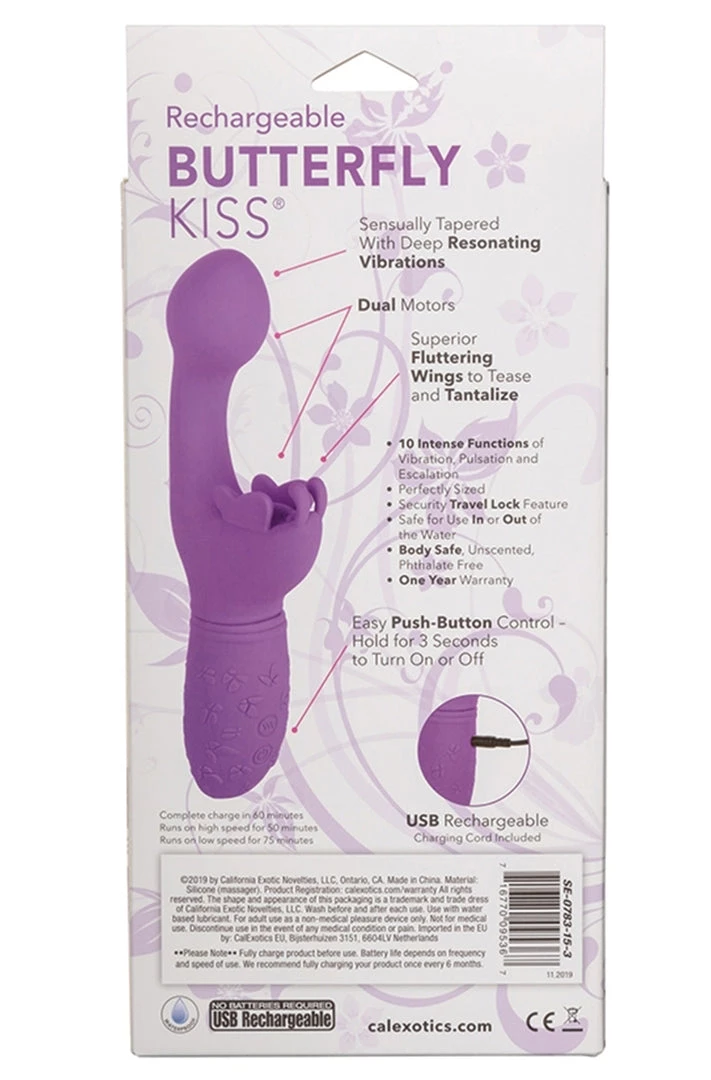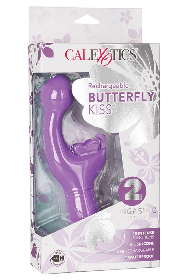 Rechargeable Butterfly Kiss Purple Vibrator from California Exotic Novelties. Designed for her intimate pleasure, the Rechargeable Butterfly Kiss is an erotic toy box must have for any pleasure loving woman. This sensually contoured massager knows your intimate curves and is here to indulge your fave pleasure point with 10 functions of vibration. The blushing butterfly is a bold option for beginners and a sensual option for the erotically experienced. Indulge in 10 intense functions of vibration, pulsation and escalation with the push-button control. Dual high intensity motors put out knee shaking vibration throughout every inch of this passionate vibrator. The fluttering wings and antennae of this flexible butterfly flutter faster with every increase of vibration to tickle external sweet spots. Get playful with up to 75 minutes of low speed or 50 minutes of high speed vibrations with the easy touch button control. Recharge your pleasure in only 1 hour with the provided USB charging cable.