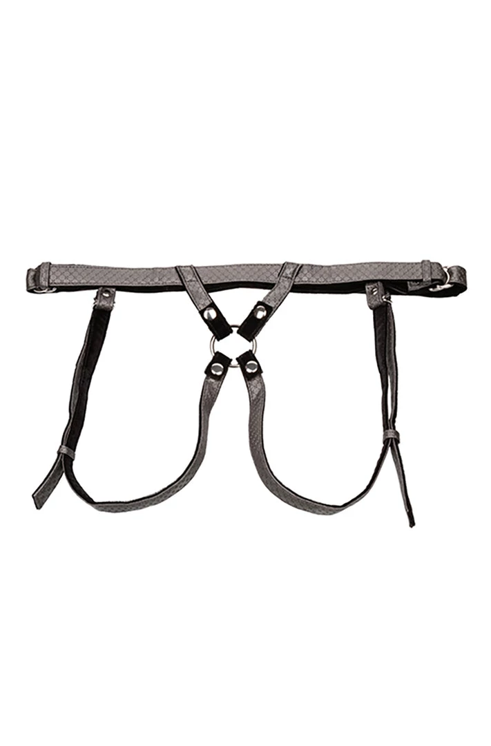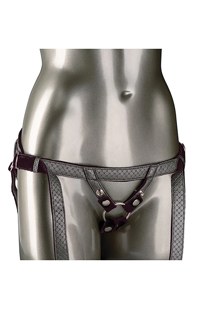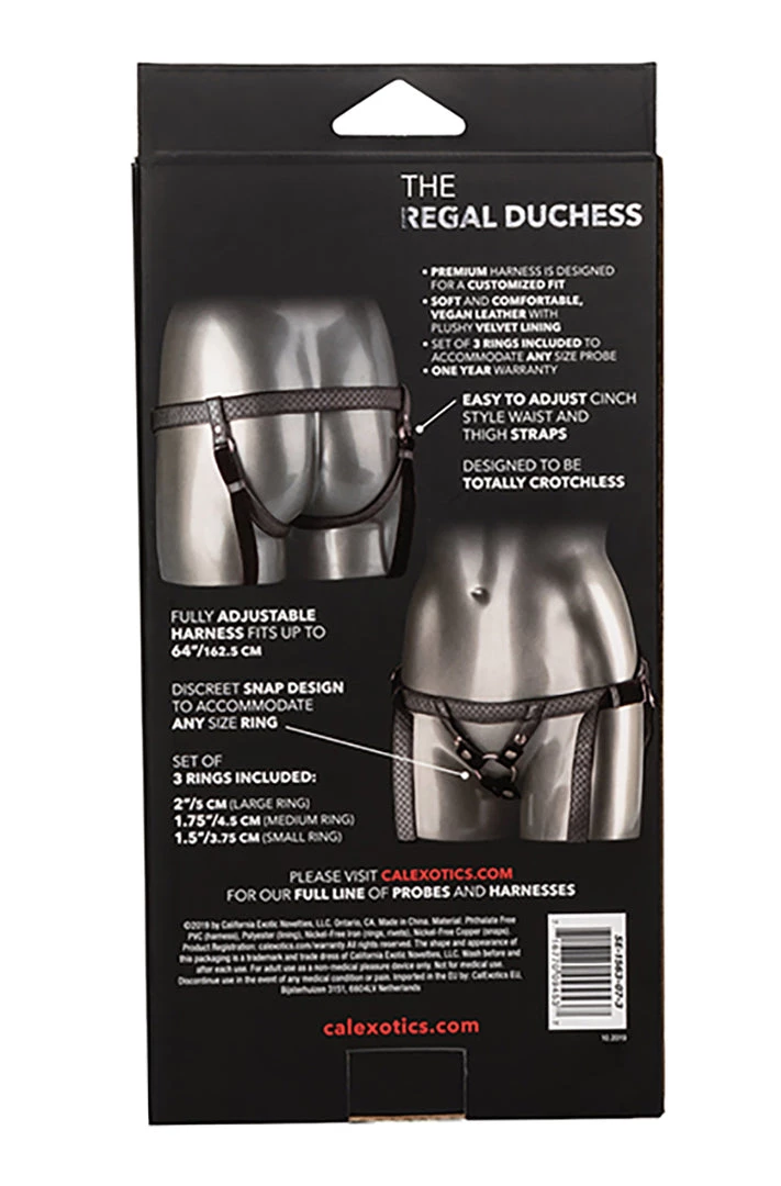 The Regal Duchess strap on harness is the perfect mix of fashion and function. Made from soft, vegan leather with a plush velvet lining. This premium harness is supportive and form fitting. Reinforced stitching and sturdy buckles. This strap on harness is crotchless and easily adjusts to fit a variety of sizes.  Front features a easy to use snap to switch and had in place dongs. Included is 3 of the most popular ring sizes. Back has a beautiful lace up detail that adjust to fit comfortably and securely. The Regal Duchess Strap On Harness is a beautiful shade of pewter perfect for any member of royalty.Â