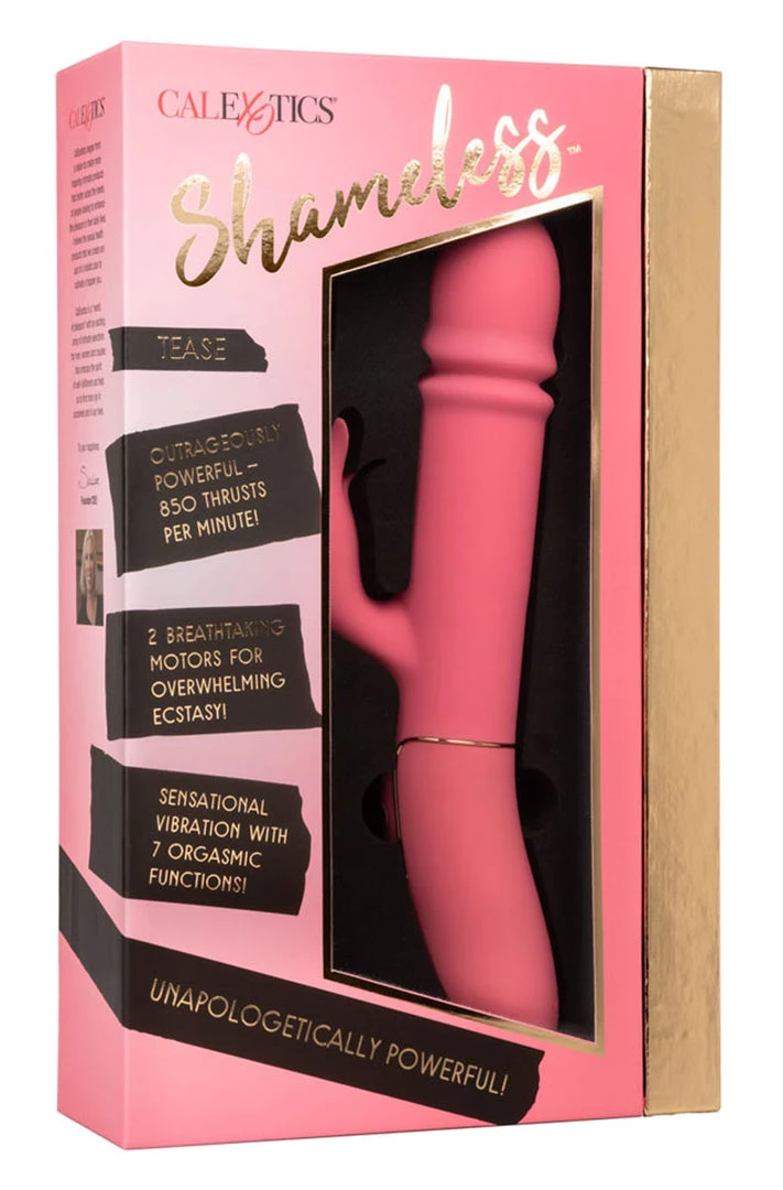 The power-packed Shameless Tease delivers earth-shaking pleasure with 7 functions of vibration, 4 functions of thrusting and a flickering teaser. This insanely powerful massager will send you speeding towards ecstasy with up to 850 thrusts per minute.