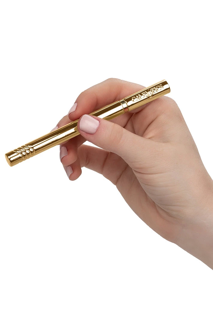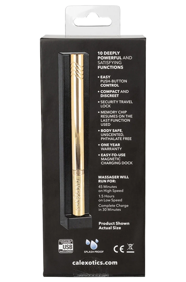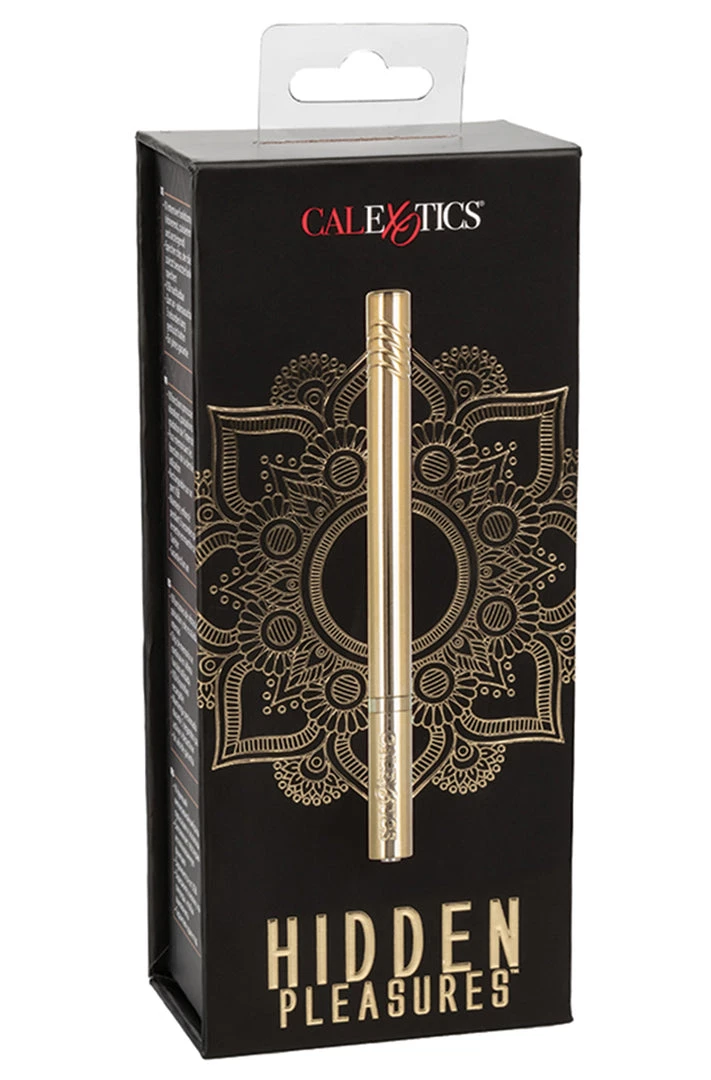 Hidden Pleasures Gold from California Exotic Novelties. The passionate Hidden Pleasures bullet is a discreet bullet vibrator packed with 10 rumbling functions of vibration. Embrace passion wherever it takes you by slipping this brilliant metallic bullet into your purse or suitcase. Use the single touch control button to effortless flicker through 10 functions of supercharged vibration, while the whisper quiet motor keeps your playtime hush-hush. While the sweet vibe gives you the stimulation you want, the integrated state of the art memory chip remembers just how you like it by starting on the last function used. Each bullet has 90 sensational minutes of vibrating stimulation and only takes 1 hour to recharge with the convenient USB charger to get you back to blissful pleasure, sooner.