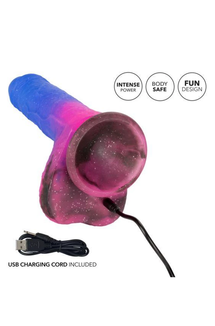 Shine inside with this vibrating glitter dildo! Soft, life-like dong with glittered finish 10 functions of intense vibration, pulsation and escalation Body safe Silicone State-of-the-art memory chip resumes on last function used Easy push-button control hold for 3 seconds to turn on or off USB rechargeable charging cord included Complete charge in 2.5 hours Runs 45 minutes on high speed and 1 hour on low speed