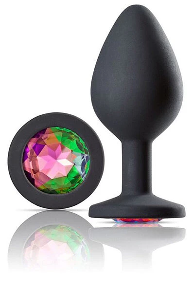 Cloud 9 Gems Black Silicone Anal Plug Large. Start with the smallest plug move to up the medium and finish with the large. Always clean before and after use. New Gems Silicone Anal Plug features anal jewelry with a stunning rainbow multi-color gem. Hypoallergenic, nonporous, odorless and body safe. Tapered for intense pleasure. Great for beginners. Smooth, phthalate free silicone design, jewel adornment. Body safe Silicone and acrylic gem. Great for temperature play. Weight .16 pound. Height 3.75 inches, diameter 1.65 inches.