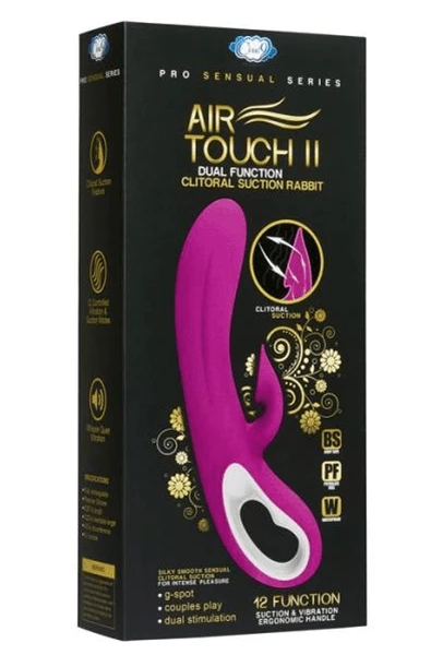 Dual Function Clitoral Suction Vibrator – The Air Touch II Ergonomic Handle version dual function clitoral suction rabbit combines sensual clitoral stimulation with a classic rabbit. Made with premium silicone, the Air Touch II Ergonomic Handle version is fully chargeable, with an ergonomic handle, and 12 independent functions. All Air Touch products come complete with a standard USB charging cord and storage pouch for convenient storage after use.