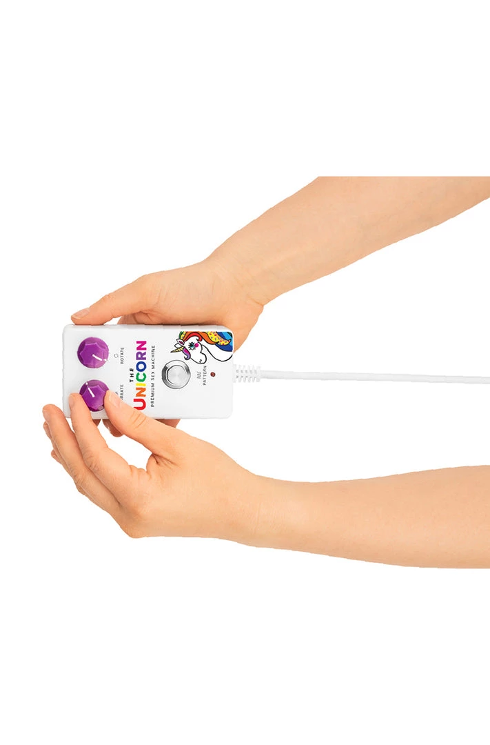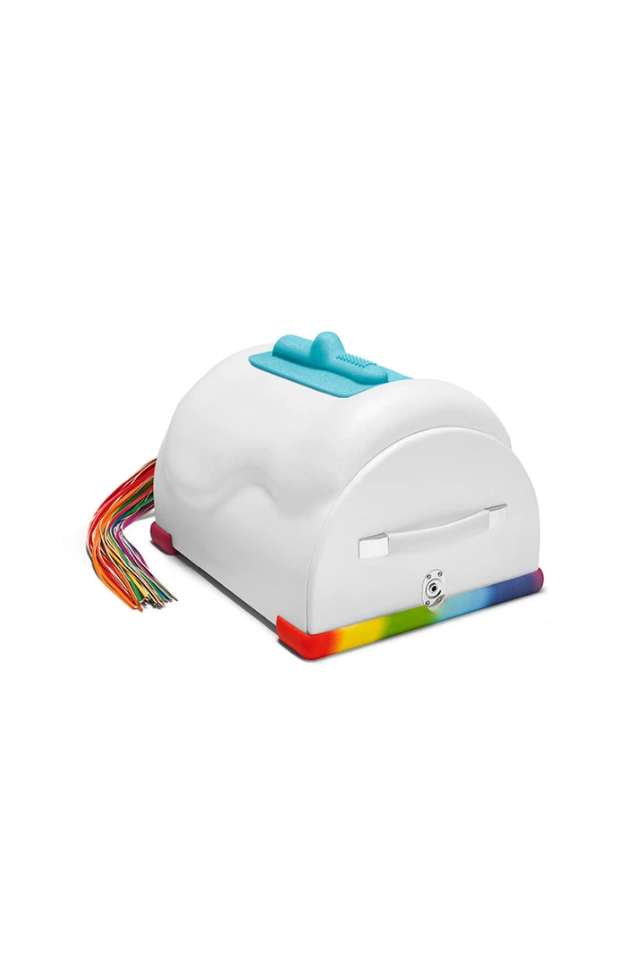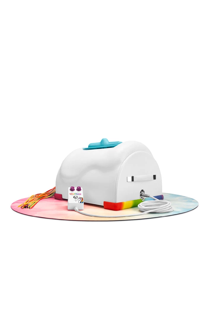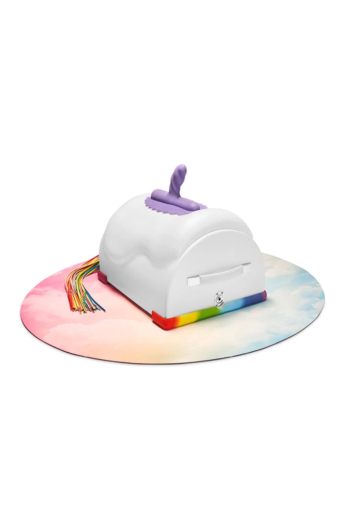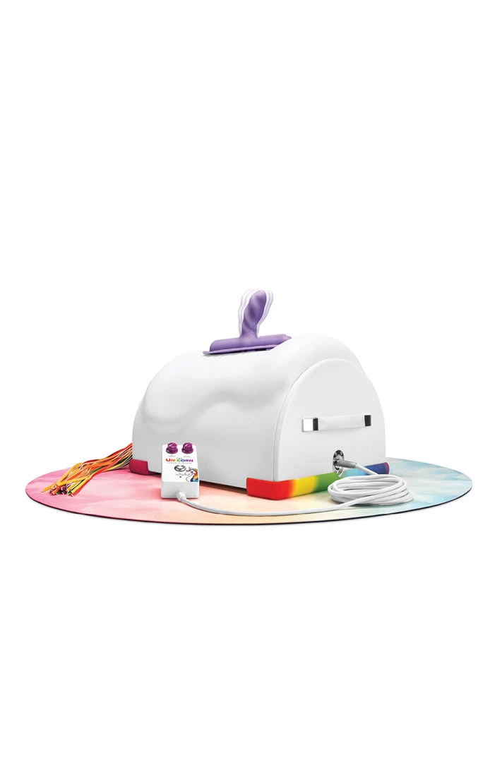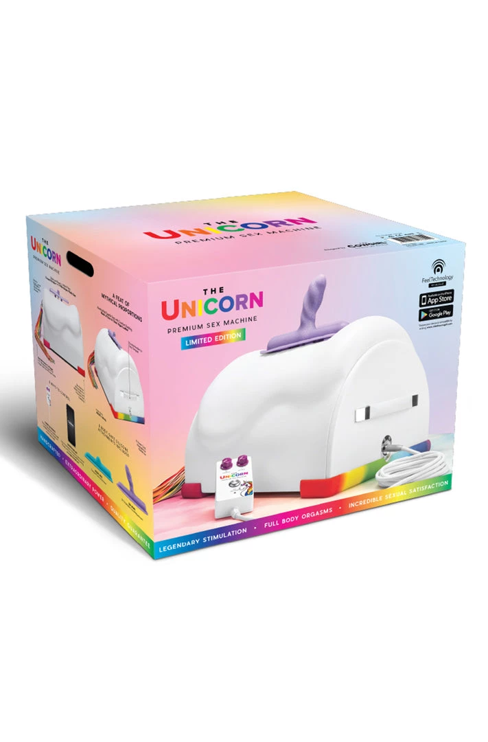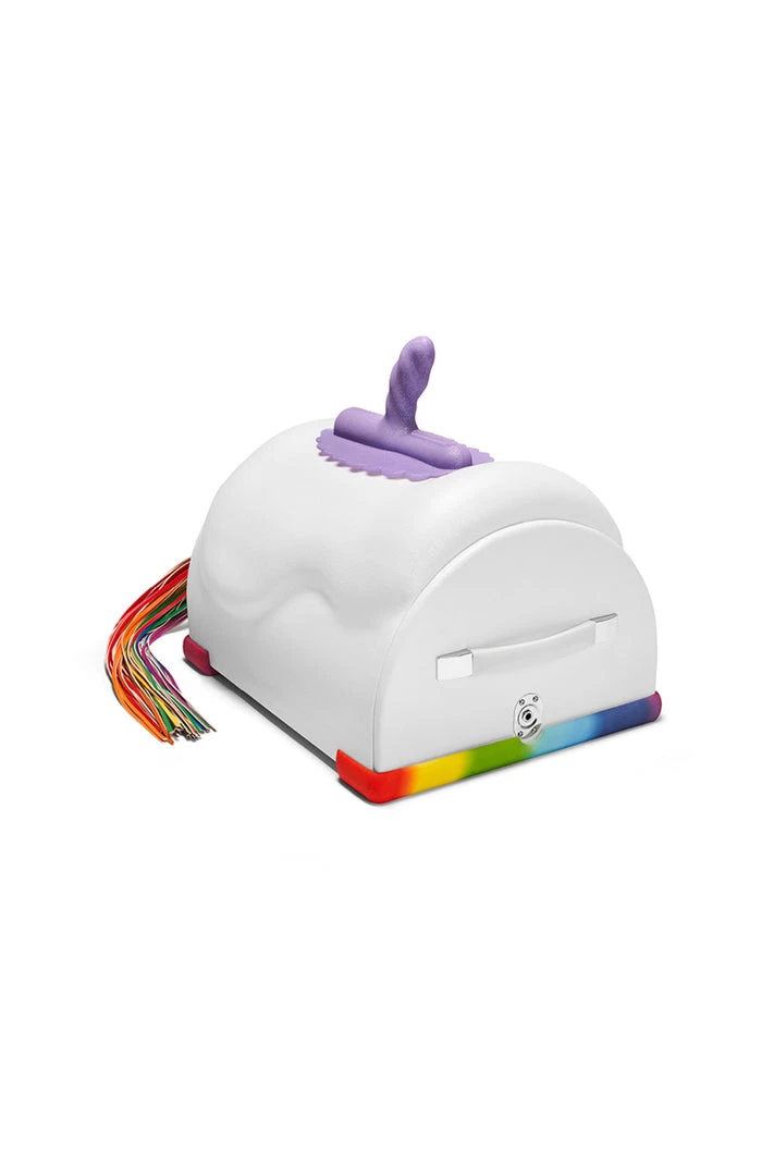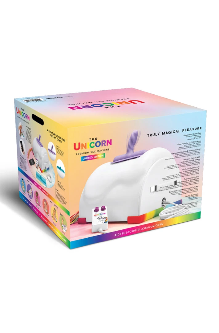 This Limited Edition Premium sex machine is a new design on the classic Cowgilrl. Featuring 2 fun fantasy attachments, riders saddle up for a ride into euphoria with penetrative and non-penetrative stimulation. They can crank up the power with a corded LED remote and bring some color to their playtime with a detachable rainbow tail flogger. Plus, with 400lbs weight capacity, the unicorn is the perfect adventure companion for solo or partner rides.