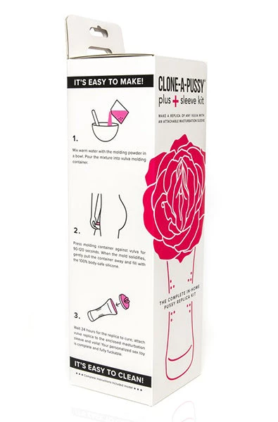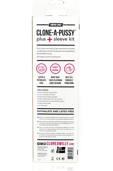 Clone A Pussy Plus Sleeve Kit from Empire Labs. The feminine counterpart of Clone-A-Willy, Clone A Pussy allows you to make a non-functional, exact replica of the outer portion of any vulva! Great for bachelorette parties, or anytime you want to gaze lovingly at your or your partner’s privates. The Clone A Pussy vagina casting kit kit allows any woman to immortalize her vaginal lips in 100% platinum cure, body safe silicone. Create an exact replica of the outer portion of your favorite vagina from the privacy and comfort of your own home with this simple pussy casting kit! It is sexy and fun to do! Perfect anytime you need a fun gift: Bachelor Parties, Bachelorette Parties, Valentine’s Day, etc. Be the hit of any party! Each kit comes with everything you need. Body safe Silicone. Algae based molding powder. Molding container Easy to follow instructions. All materials and packaging made right here in Portland, Oregon, USA!