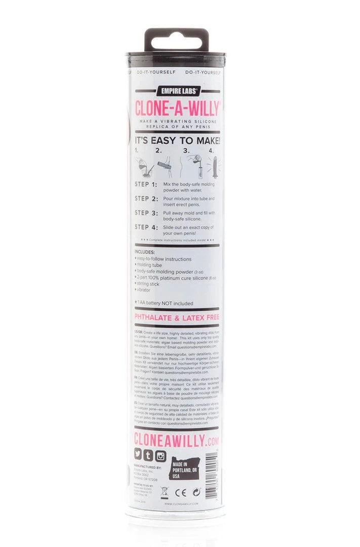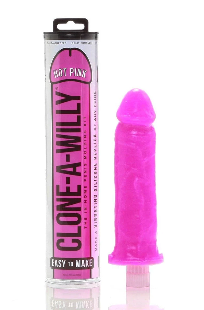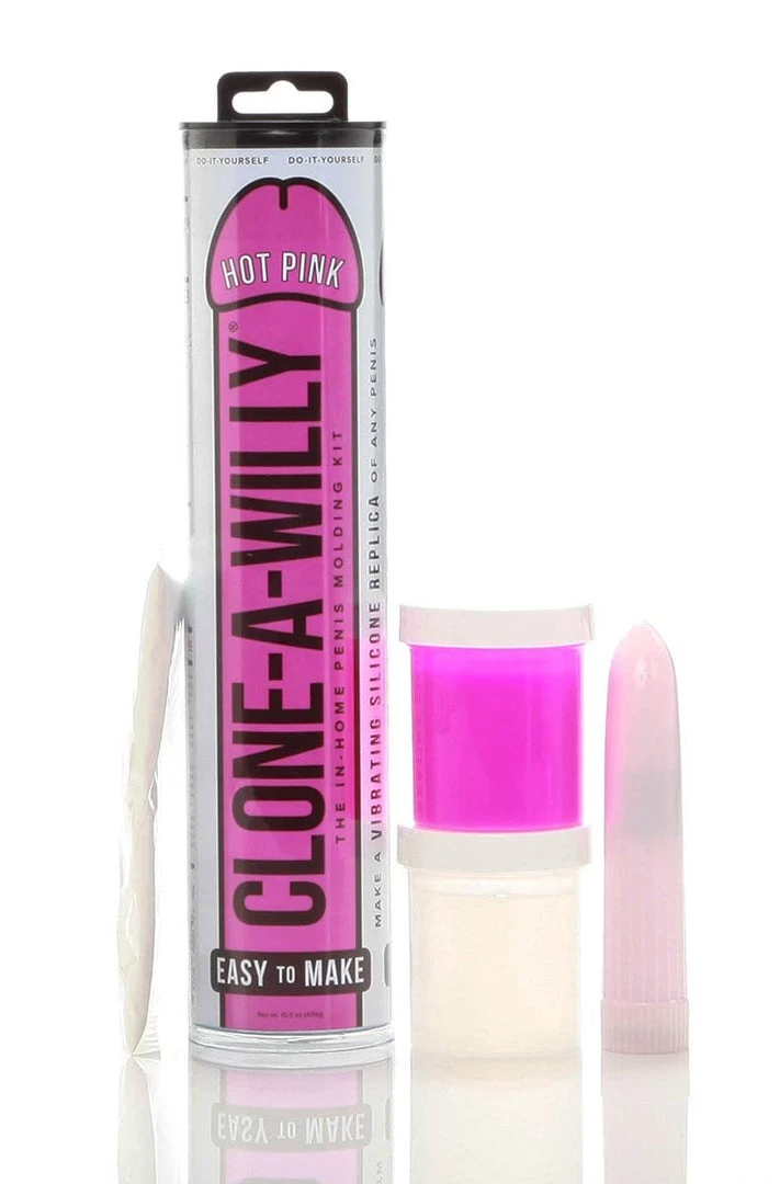 Clone A Willy Hot Pink Glow in the dark, it is a complete kit that perfectly copies a man’s own penis in super realistic materials. Each kit comes with easy to follow instructions and includes everything necessary to produce an exact copy of any penis! Your finished dildo is made from a proprietary skin like substance that is not latex or silicone, but a completely safe, non porous material that is hypoallergenic and non-toxic. It is currently being used throughout Hollywood to create incredibly lifelike masks and special effects. Unlike silicone, it will not break down when used with water based or silicone based lubricants.Â