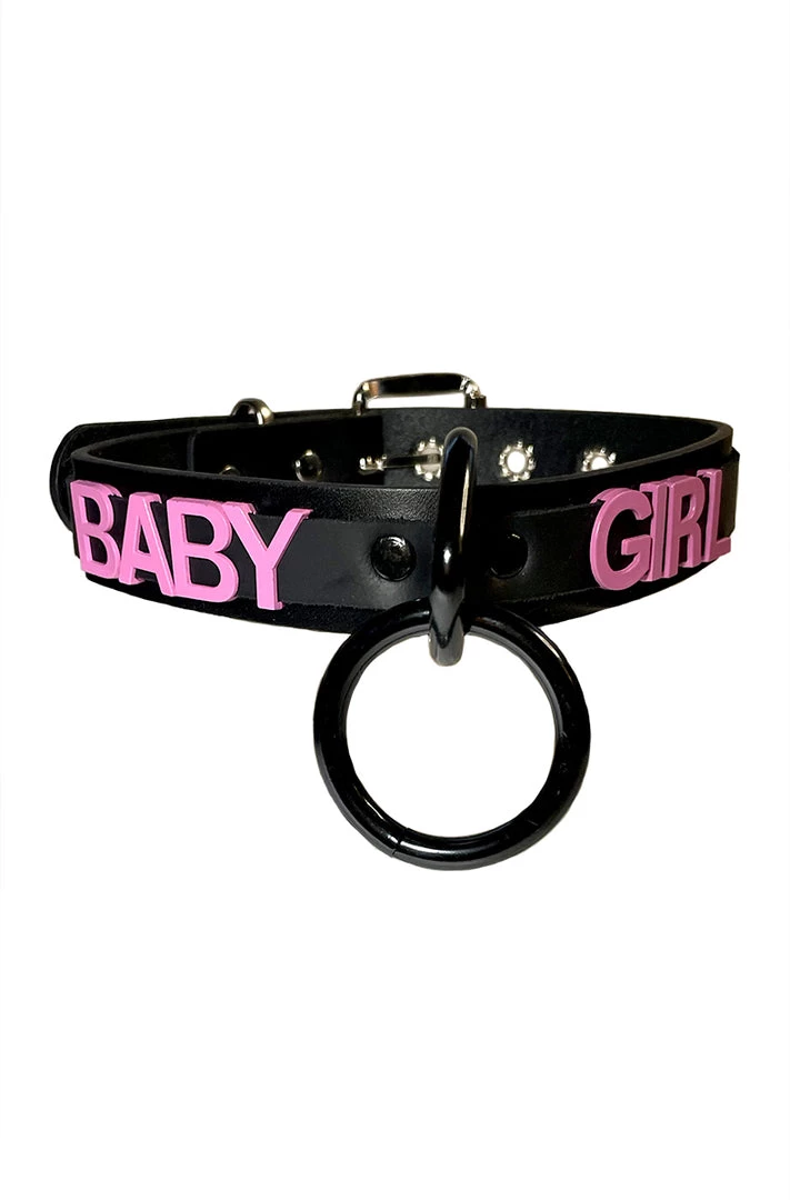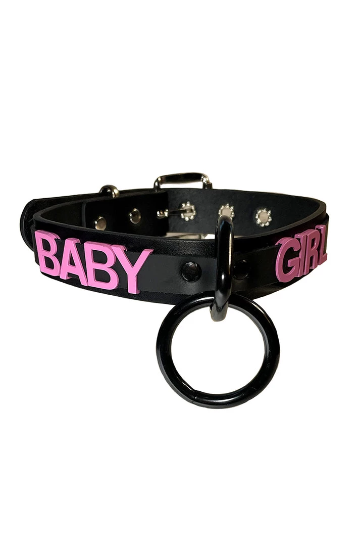 Babygirl BDSM collar. Black vegan leather collar with pink letters and large o ring to attach your favorite leash. Adjustable with buckle and holes in the back. Made extra strong to pull your babygirl next to you.  Daddy loves you! Premium Vegan Leather. Hand made in the USA