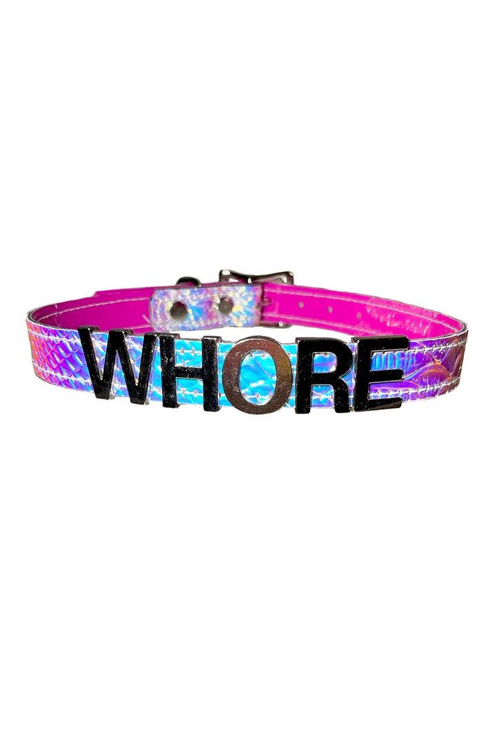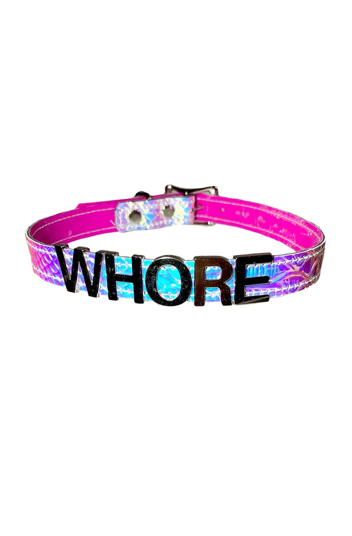Holographicย whoreย collar. Snake skin holographic collar with sliver letters. Adjustable with buckle and holes in the back.ย Made extra strong to pull your favorite hoe a bitย closer. Whore’s do it better! Premium holographic Vegan Leather.ย Handย madeย in the USA
