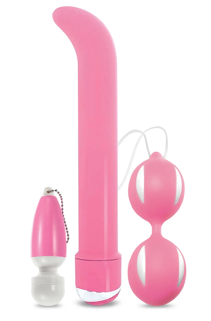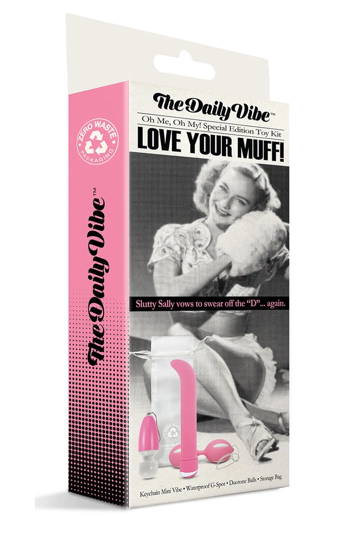The Daily Vibe Love Your Muff Toy Kit comes with a keychain mini vibrator. Perfect for on the go. Splashproof and batteries included. Waterproof G-spot vibe. 7.5″ curved tip vibrator with 7 powerful functions. 2AA batteries (not included) Â Duotone kegel balls. Tighten and tease with 4.8″ x 1.4″ kegal balls. Loop for easy retrieval.