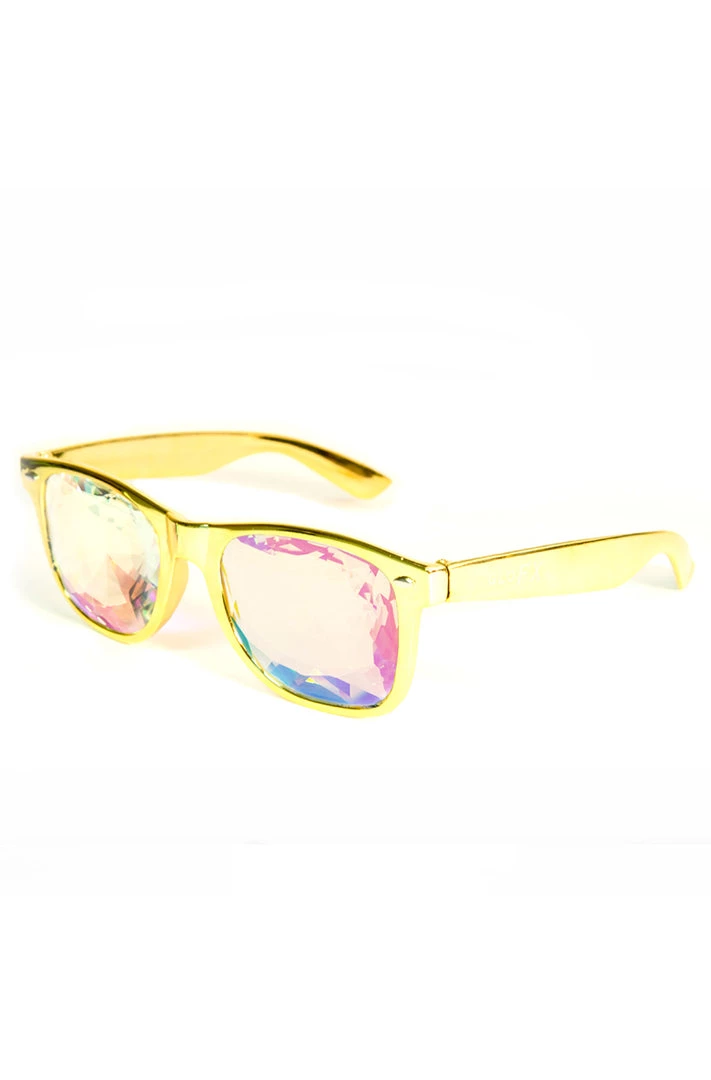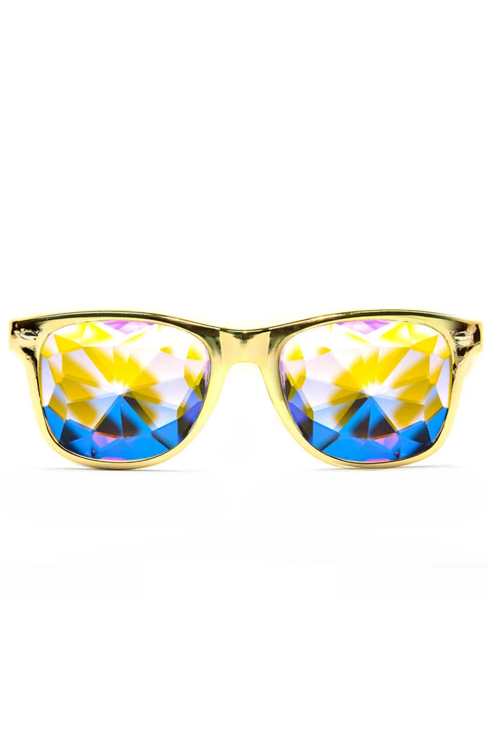 This all gold frame reflectsย almost as much light as our crystals! We consider this our most outspoken design for the extreme prismatic kaleidoscope fan.ย The user can now see a widerย view of richย prismatic colors with our most popular frame style in a jaw dropping reflective color. Weโve engineered the Ultimate Kaleidoscope Glassesย for any fractal glassesย connoisseur.