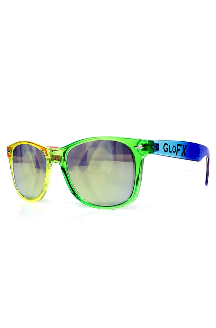 DGrab a pair of GloFX Transparent Rainbow Diffraction Glasses and blast off into a world of prismatic bliss. Wear your most colorful rave gear with these glasses and you’ll never worry about colors clashing. The see-through rainbow frame sports a blend of your favorite colors that guarantees to match with anything in your wardrobe and add a colorful flair to any outfit. The gradient light diffraction effect of the Ultimate Diffraction Glasses is directly infused into the hard Plexi-Plastic lenses. This laser etching process makes for optimum light diffraction that presents a crisp, clean, and even effect from edge to edge. Try these glasses on and see three times the traditional light diffraction effect. The extreme durability of these glasses really makes them stand out from the competition. Created from a 100% True-Flex PVC Plastic frame, these glasses can bend, flex, and withstand any torture. Never before have diffraction glasses been able to withstand such extreme environments and last so long! Make the right decision and purchase a pair of GloFX Ultimate Diffraction Glasses today!
