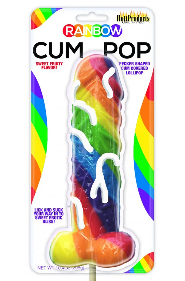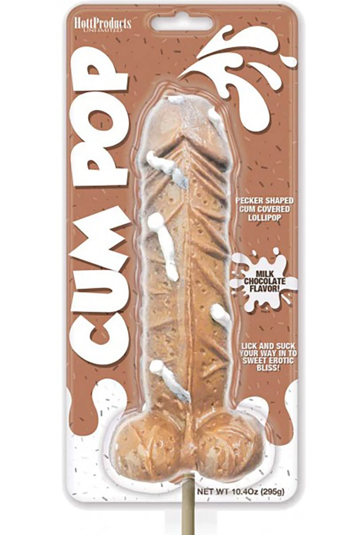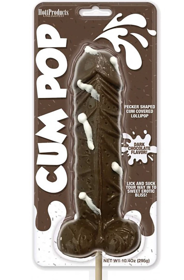 Cum Pop Sucker is a giant sized penis shaped sucker with fake cum. Comes in Milk Chocolate, Dark Chocolate, and Rainbow fruit lollipop  10.4 ounces net weight make this bigger than some real cocks! Have fun licking this sucker all night long!
