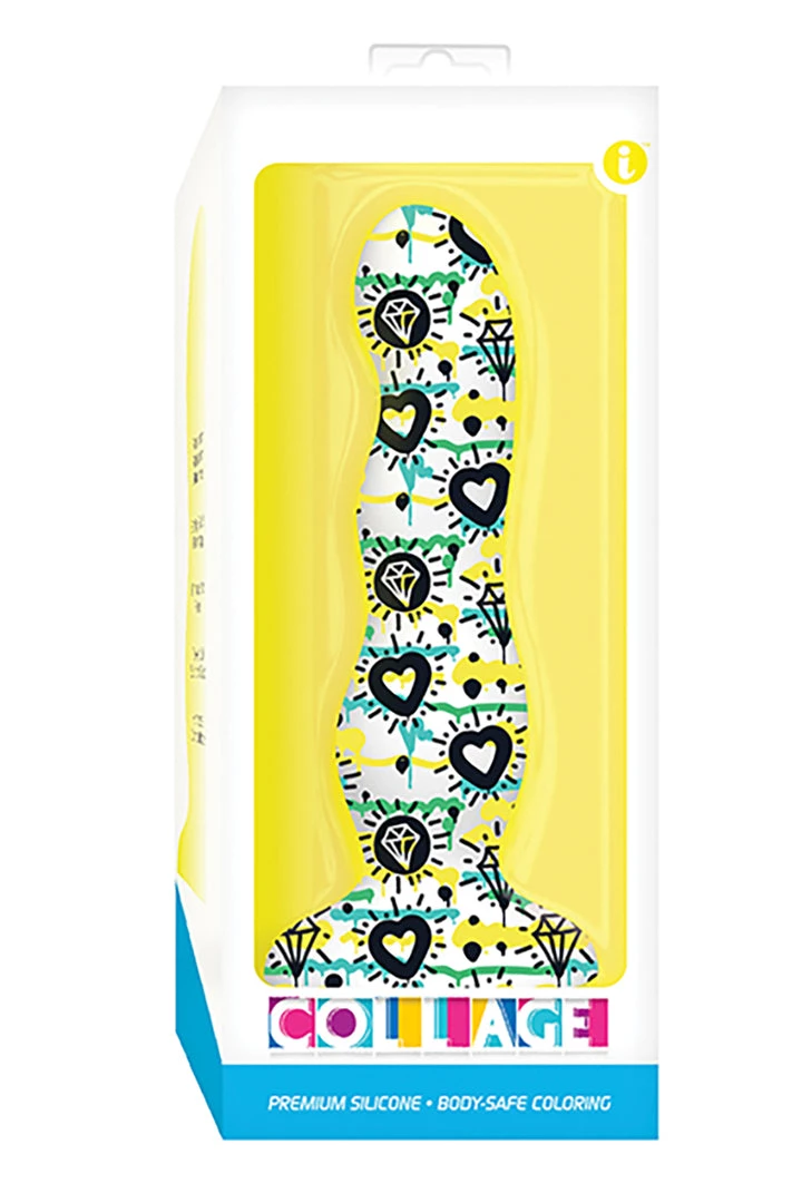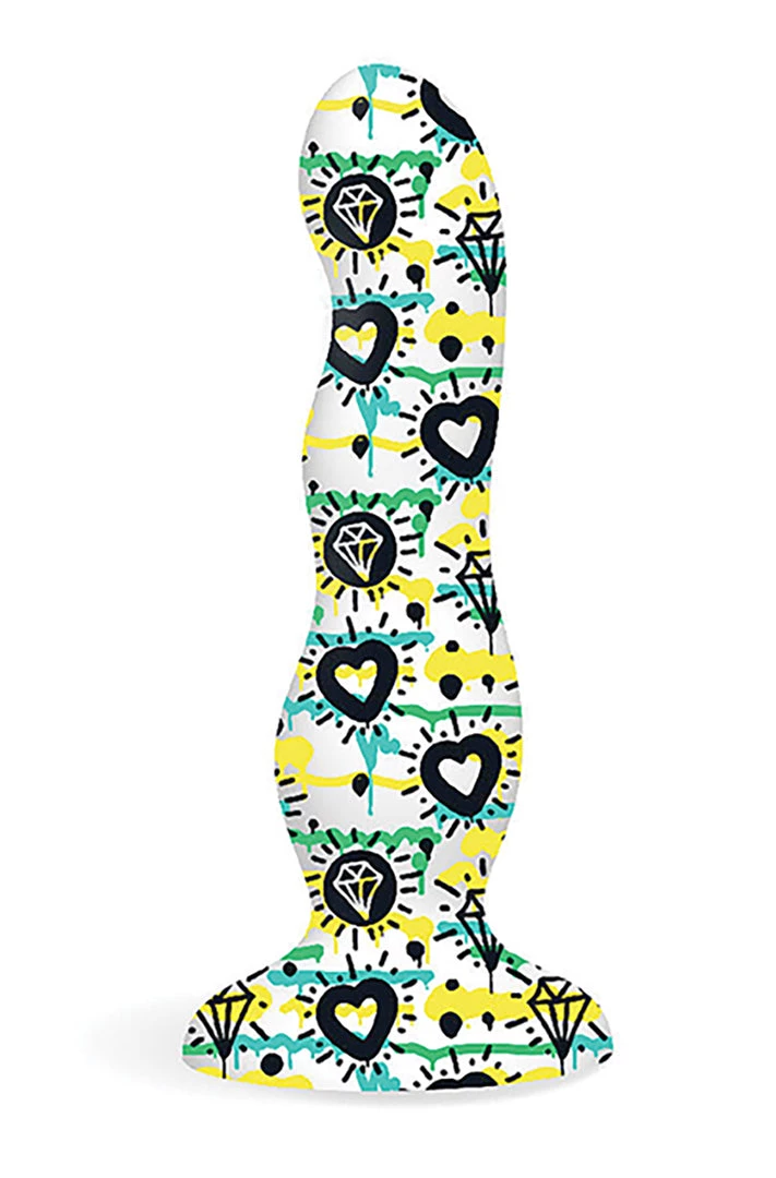 Introducing the most beautiful silicone ever, the Diamonds & Hearts Curvy Silicone Dildo, with eye-popping designs “tattooed” right onto the silicone. Soft and silky and just the right size, they’re colorful, whimsical, elegant and stunning. Each features an ultra-grip suction cup* which also makes them harness-compatible. They quickly warm to your touch, are non-porous and easy to clean. Just use gentle soap and warm water. Collage… for all your senses, all at once.