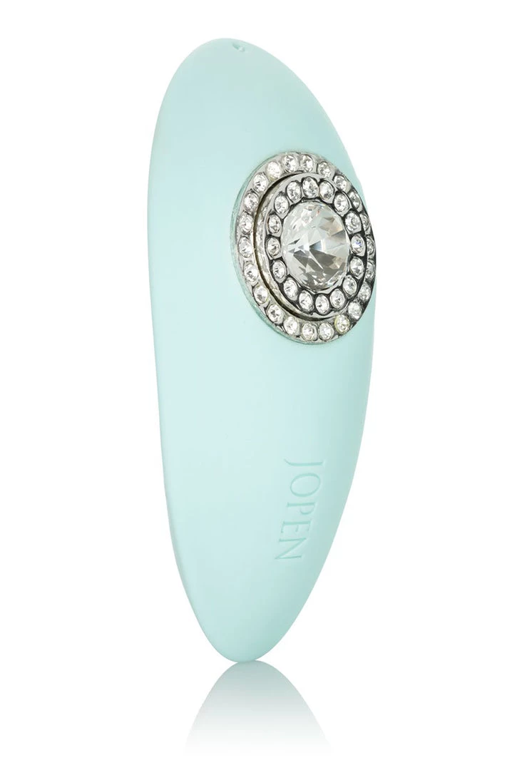Jopen Pave Grace Teal Green Mini Palm Sized Massager. Treat yourself to the sparkling Pave Grace, a mini massager with sparkling crystal adornments, ergonomic curved shape and sensational vibrations for a one of a kind pleasure experience. Fit this mini massager perfectly in your palm and enjoy full control over the indulgent vibrations and versatile massager shape. The ultra smooth curved shape is covered in a premium silicone with two sleek profile buttons. This silky smooth vibrator is packed with 7 functions of vibration and 5 independent speeds for each function for stimulation made just for you. The easy touch control buttons let you effortlessly flicker through each function of vibration, while increasing or decreasing the function intensity. Whether you are taking a dip with a lover or indulging in a steamy solo session, look forward to up to 2 hours of waterproof vibration. Recharge pleasure and get back to playtime in only 2 hours with the provided USB cable. The hypoallergenic luxury teaser is made from Satin Finish silicone with glass crystal adornments.
