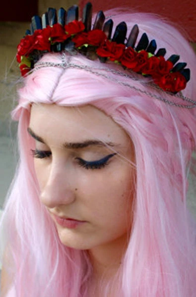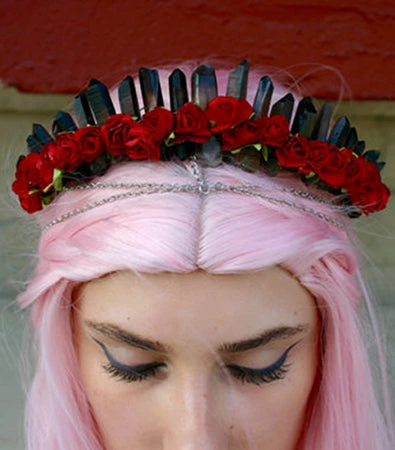 Handcrafted withย black crystal quartz, paper roses and lined with lace.