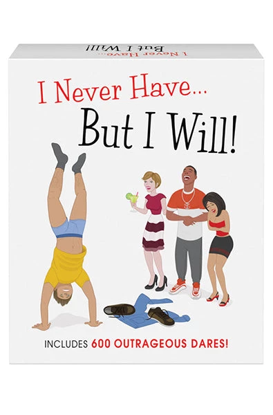 I Never Have But I Will adult game of dares. The crass party game with over 600 dares! After an I Never Have statement is made, players indicate who of them have never done the action. The first of these players who announces, But I Will then acts out the dare and earns the card as a point. Play for points or as a drinking game! You can even offer a prize to the winner, such as candy, wine, a back rub, or a spanking! Includes: a die and 100 dare cards. Adults only please.