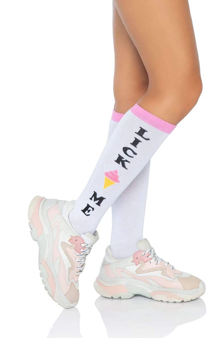 Lick MeĀ Socks are perfect for the summer. WhiteĀ and pink color block design with a ice cream coneĀ and the words Lick Me. KneeĀ length socks with color heal and toe. Soft and comfy. One size fits most
