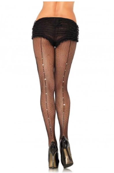 Professional rhinestone backseam fishnet tights with nylon/cotton comfort sole and no-roll comfort waist band. One Size Fits Most
