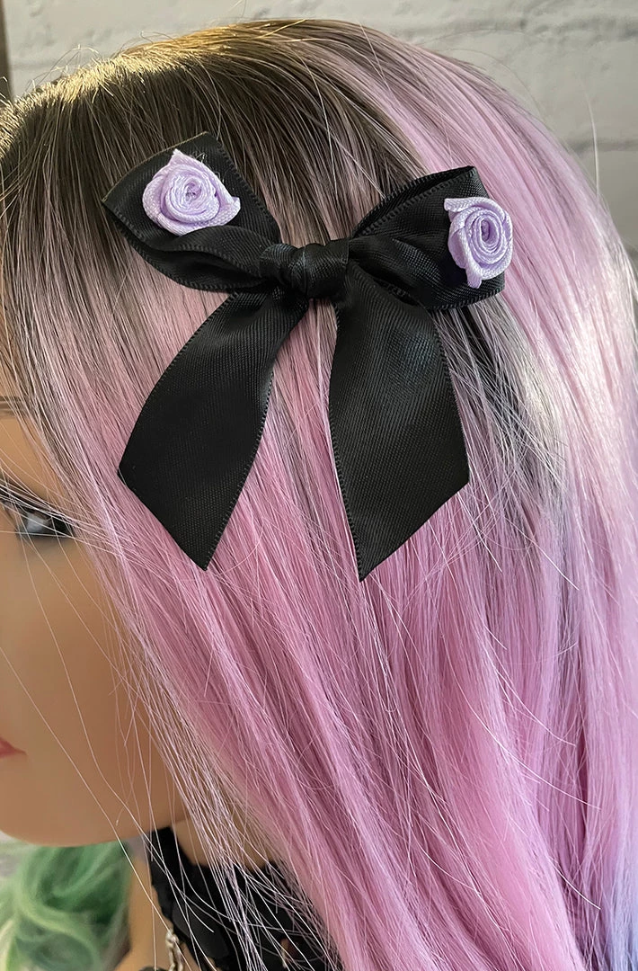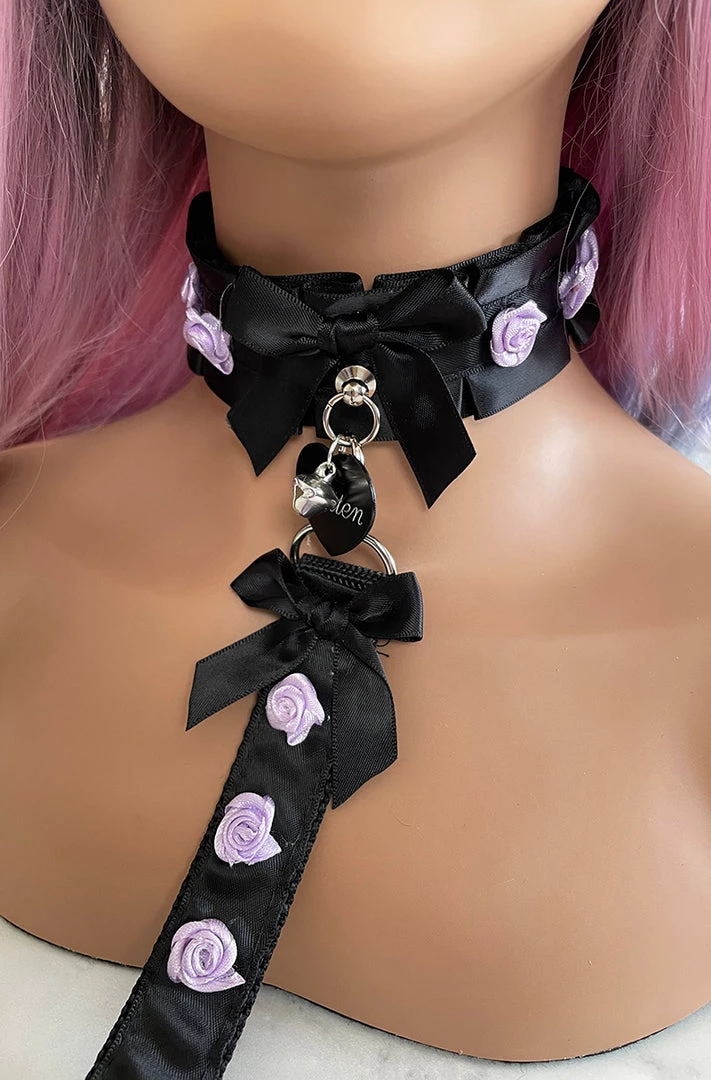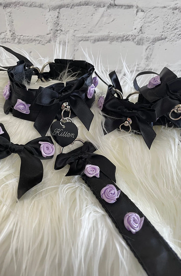 Show off your submissive side with this cute 5 Piece Black Ribbon BDSM Collar and Leash Set. Comes with collar, leash, 2 wrist cuffs and hair bow. Black ribbon with purple rosettes  The back is closed with D rings and ribbon. Will fit any neck size. You can add the option of a tag and bell in front. Select from the phrasesÂ