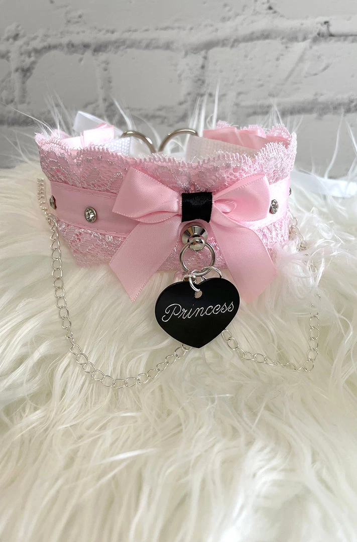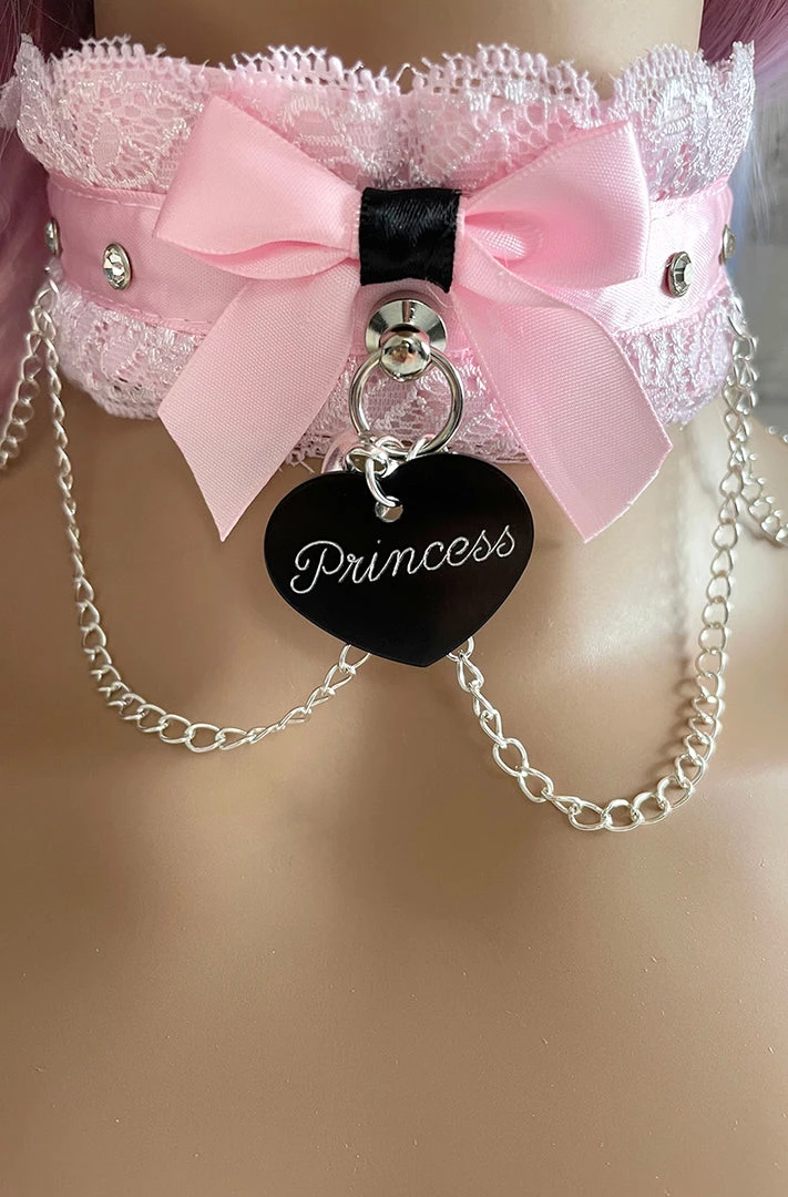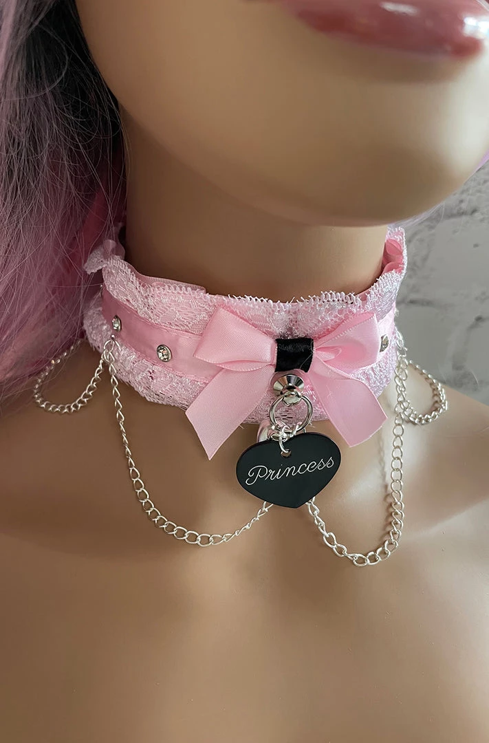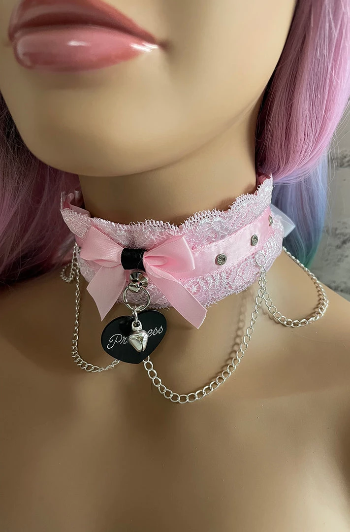 Show off your submissive side with this cute Pink Lace BDSM Collar. Pink lace and ribbon with clear rhinestones and silver chains. The back is closed with D rings and ribbon. Will fit any neck size. You can add the option of a tag and bell in front. Select from the phrasesÂ