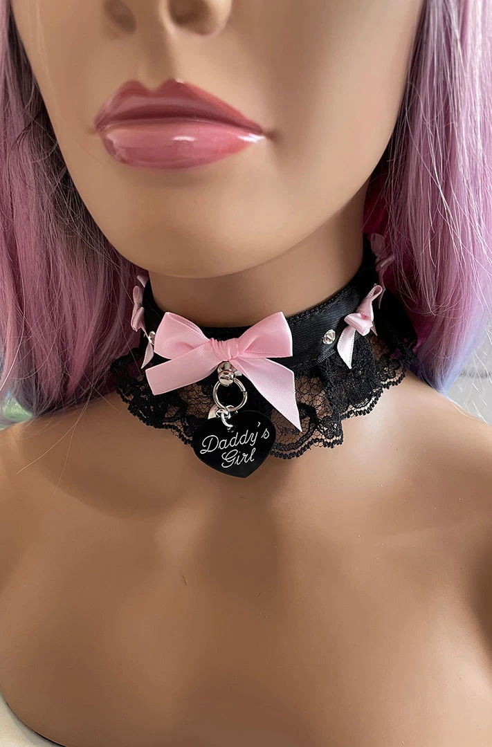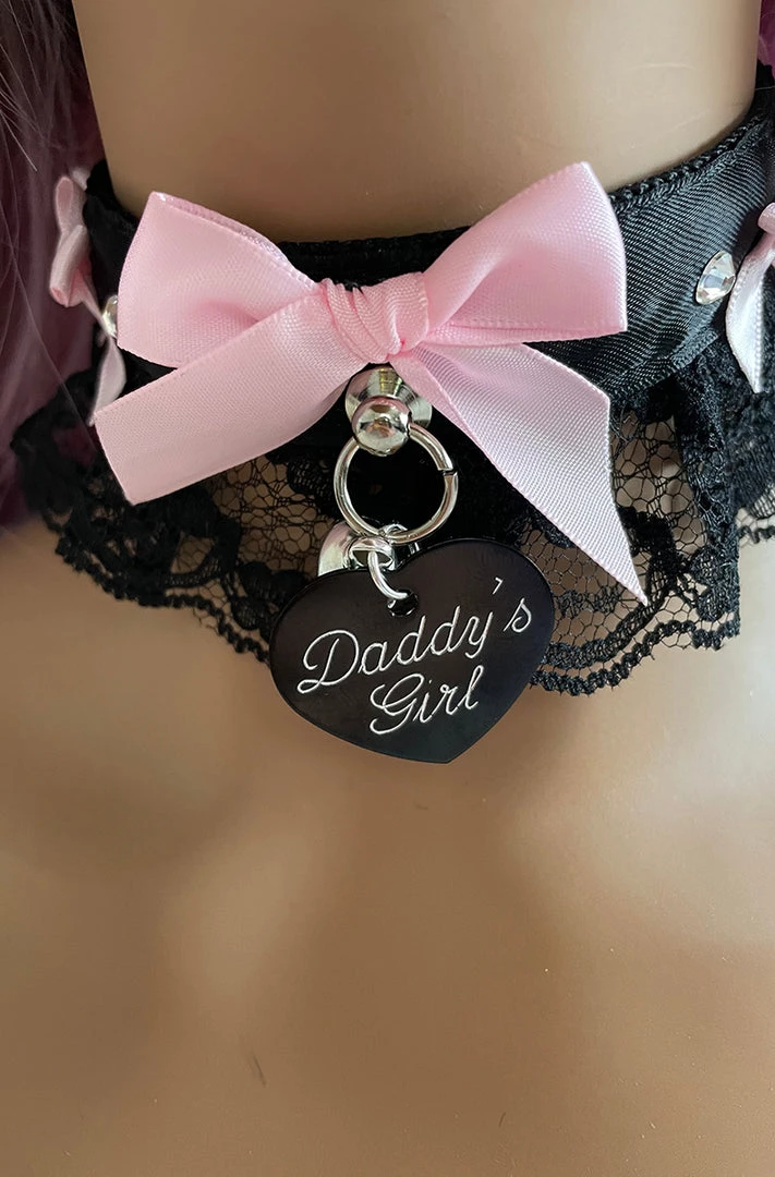 Show off your submissive side with this cute Pink and Black Lace BDSM Collar. Black lace and ribbon with any pink bows. And clear rhinestones all around. The back is closed with D rings and ribbon. Will fit any neck size. You can add the option of a tag and bell in front. Select from the phrasesÂ