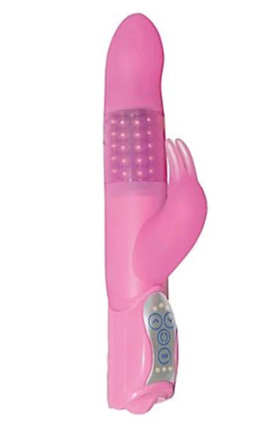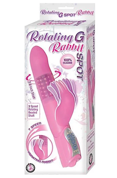 Rotating G-Spot Rabbit Vibrator Pink features 100% Silicone. 3 speed reversible rotating beaded shaft. 7 speed variable vibrating rabbit ears. Easy to use. EZ to use controller. Waterproof vibrations for play in and out of the water. Made using phthalates free, RoHS compliant materials: shaft, rabbit clitoral stimulator Silicone, Control ABS plastic. Vibrating sex toy requires 3 AA batteries, not included. Do not leave batteries in the vibrator between uses. Always clean before and after use. Size: total length 10.25 inches, Shaft 7 inches, Diameter 1.625 inches, Rabbit 3.5 inches. Rotating G-Spot Rabbit Vibrator from Nasstoys of New York.