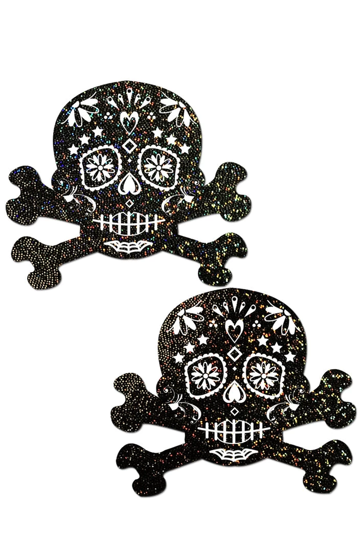 Black Glitter Candy Skull & Crossbones Nipple Pasties by Pastease® areĀ hand-made in the USA of soft form-fitting glittery material Ā thatĀ forms seamlessly to curves and resists wrinkling over hardening nipples.Ā Ā