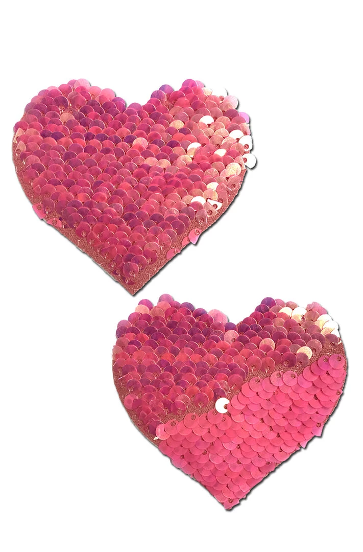 Love: Hot Pink & Matte Pink Color Changing Sequin Heart Nipple Pasties by Pastease® are hand-made in the USA of reversible sequin material that forms to curves to resist wrinkling over hardening nipples.Â