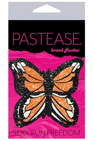 Glitter Orange & Black Butterfly Nipple Pasties by Pastease are hand-made in the USA of durable no-mess glitter pleather material that forms to curves and resists wrinkling over hardening nipples. Just peel-and-stick on clean, dry skin. All Pastease feature latex-free, medical-grade, waterproof adhesive that stay securely in place for as long as you like and until they are gently removed. Conceal or Reveal with Pastease nipple pasties when worn with a sexy outfit, daring bikini, sheer top, revealing dress, Hefty bag, body lotion, crazy costume, party theme or nothing at all! Dimensions: 3.3 inches x 3.2 inches. Coverage Diameter: 2 inches.