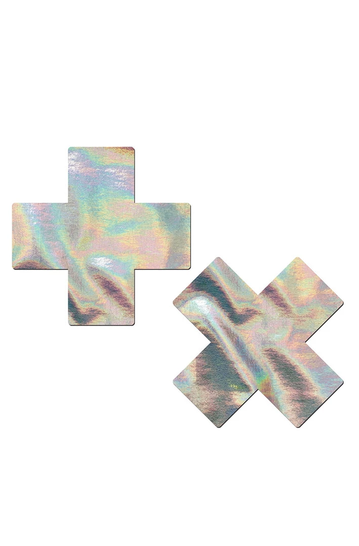 Plus X: Silver Holographic Cross Nipple Pasties by Pastease® are hand-made in the USA soft form-fitting holographic material that forms seamlessly to curves and resists wrinkling over hardening nipples.Â