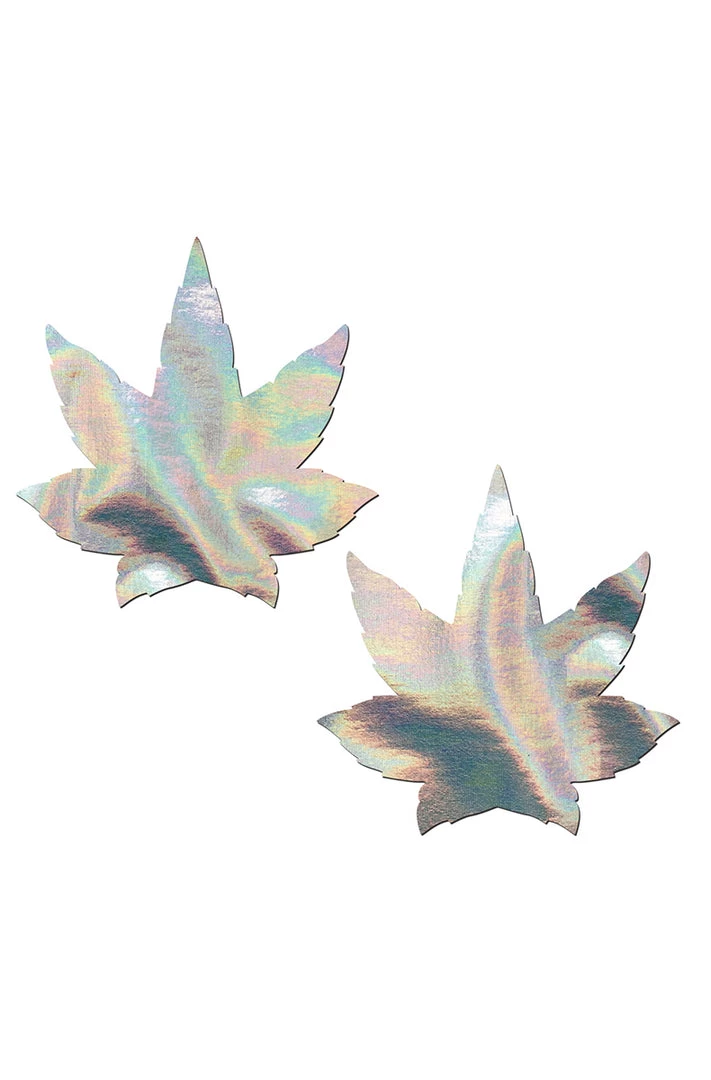 Indica Pot Leaf: Silver Holographic Weed Nipple Pasties by Pastease® are hand-made in the USA of form-fitting holographic material that forms seamlessly to curves and resists wrinkling over hardening nipples.