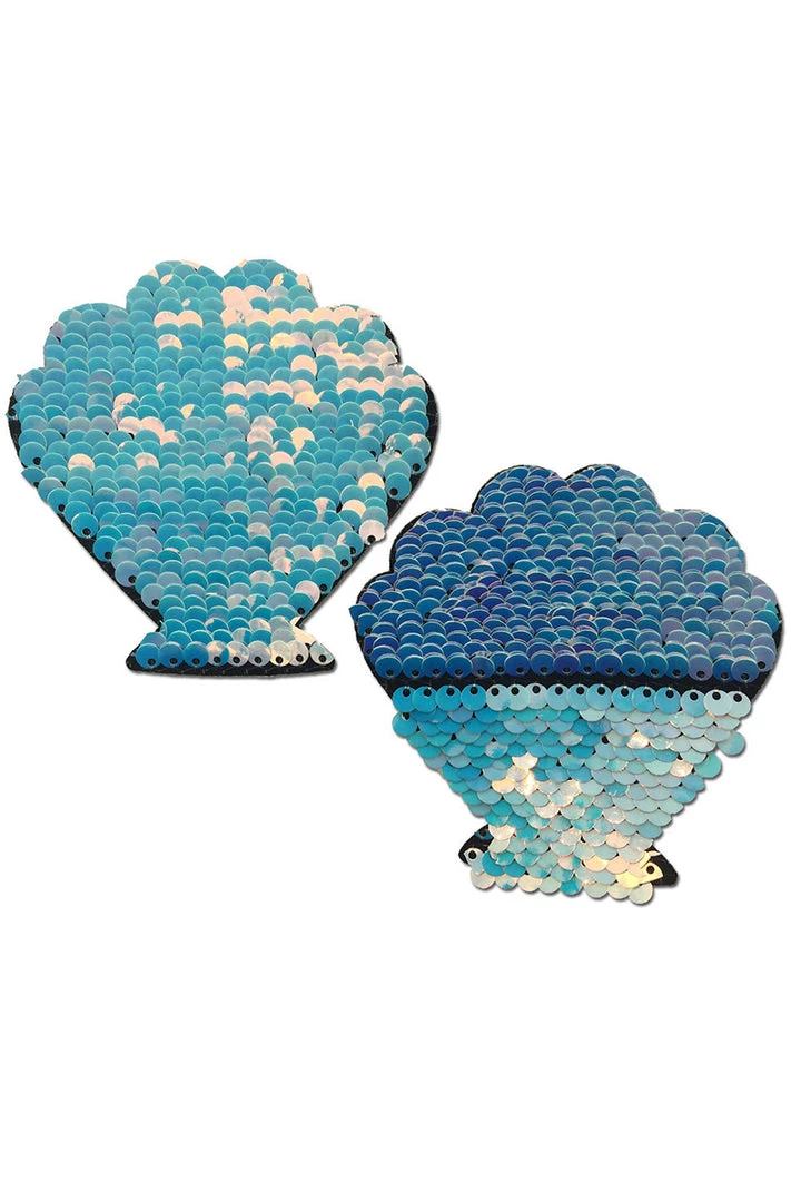 Unicorn Blue Pink Flip Sequin Shell Nipple Pasties by Pastease® are hand-made in the USA of iridescent maximum overload magical unicorn color changing sequins with a full spectrum rainbow of other-worldly color ranging from metallic baby blue to electric ultraviolet to mirrored hot pink. Featuring 4th dimensional black light-reactive colors too!