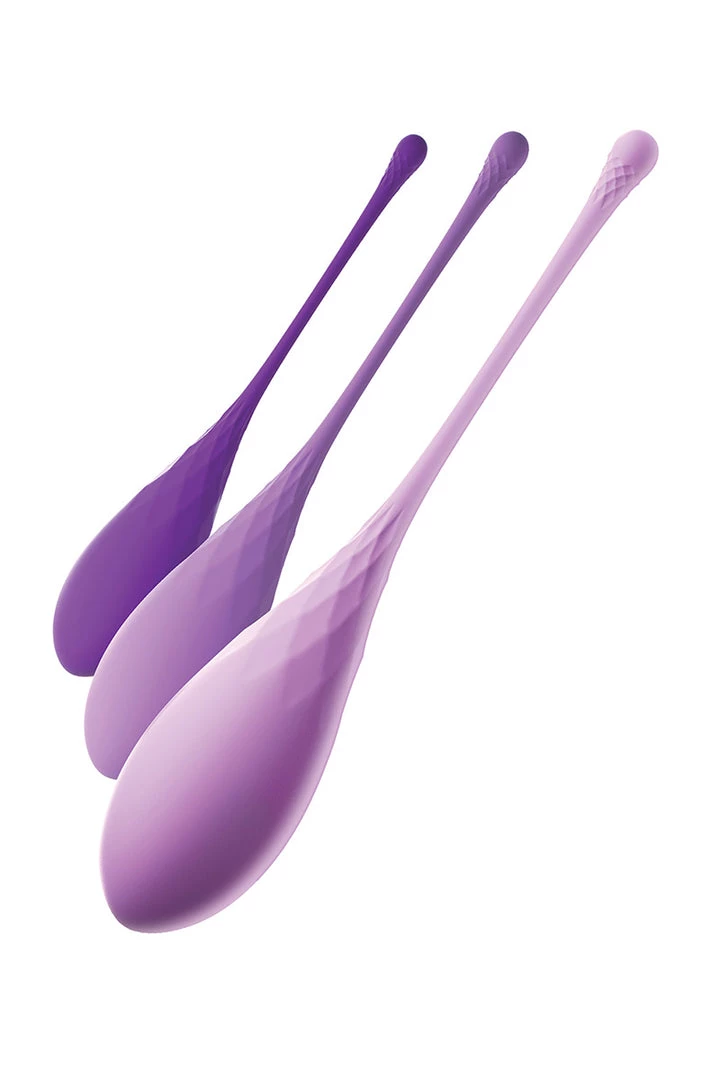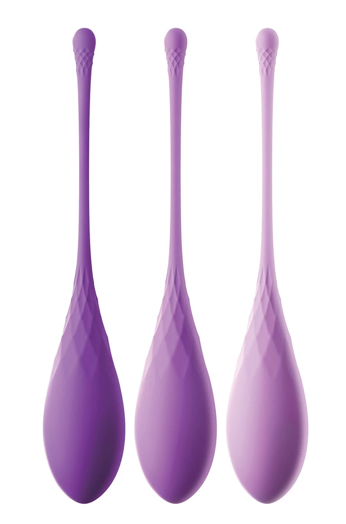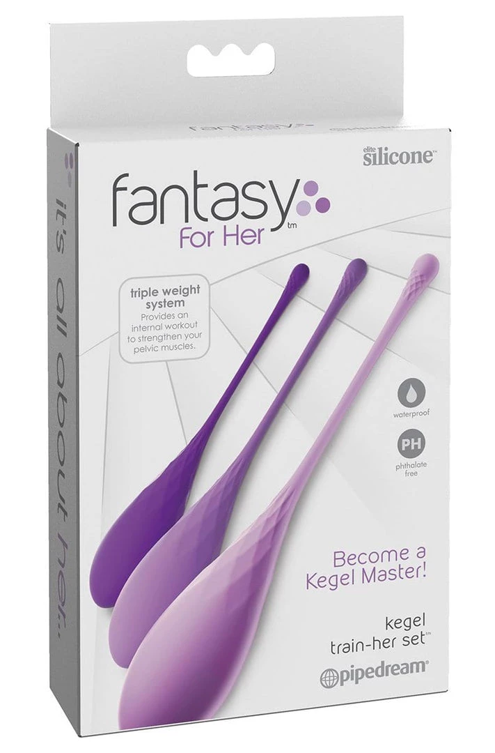 Fantasy For Her Kegel Train-Her Set Purple. It was her little secret. She had started with the lightest Kegel train-her almost two weeks ago and had worked her way up to the heaviest Kegel train-her. At first, she was a bit nervous about inserting something weighted into her vagina. But the lightest Kegel train-her did not seem that heavy and she found that when she placed the soft silicone near her opening, it easily slid inside her as if it belonged there. She enjoyed the full feeling and intimate sensations when body responded to it, and the sexual dampness that sometimes occurred when she wore it. She found herself craving the feeling of her Kegel train-her inside her. Soon she had wanted the heavier weight of the medium Kegel train-her. She was so excited that she almost could not sleep the day before she planned to wear it! She had worn it for almost a half an hour at various times during her week right after her shower, while she shopped, during work, and even during her yoga class where she found herself becoming more and more aroused as it pleasingly shifted inside her with every new yoga pose. And today marked day 14 of exercising with her Kegel train-her, and the third time she had worn the heaviest weighted version. She could not believe how strong her vaginal muscles felt! It was as if she had a personal trainer for her vagina. Sometimes she would insert one and practice squeezing. Other times she would just insert one and enjoy the weight and feeling of holding it in. She was looking forward to surprising her partner this evening when she forcibly milked his shaft over and over during sex play. She knew he would enjoy these new sensations as much as she would. She also knew that her Kegel train-her set had given her would give her a brand new confidence in her sexual pleasure and performance. She planned to continue her Kegel workout to keep her most intimate parts toned and tight. Self care had always been important to her and now she could enjoy wellness inside and out. Size length 7.25 inches, width 1.1 inches, height 1.1 inches. Phthalates free materials Silicone, Metal. It is all about Her.