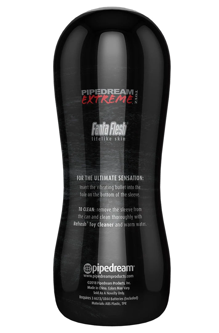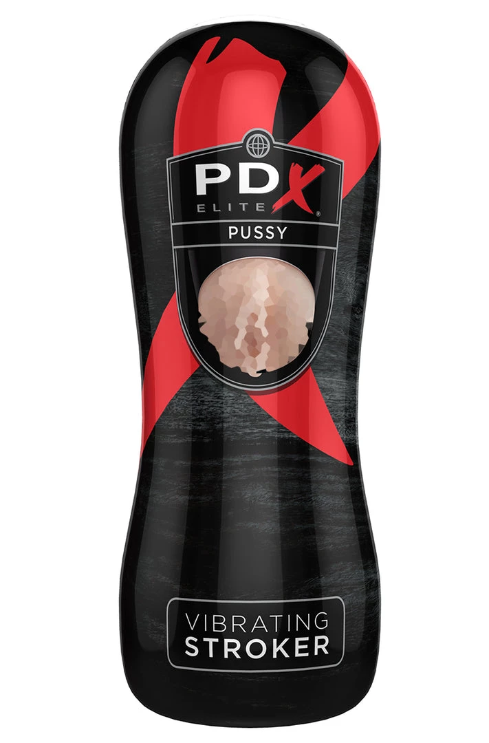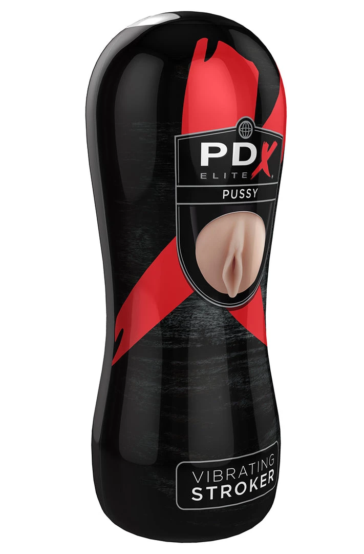 PDX Elite Pocket Pussy Vibrating Stroker for the ultimate sensation. Insert the vibrating bullet into the hole on the bottom of the sleeve. Cleaning instructions: remove the sleeve from the can and clean thoroughly with Refresh Toy Cleaner and warm water. To preserve your PDX Elite Vibrating Pussyl Stroker’s original softness, apply Fanta Flesh Revive powder after it has dried. Features: batteries included, Realistic Fanta Flesh, Phthalates free, waterproof, discreet, vibrates.