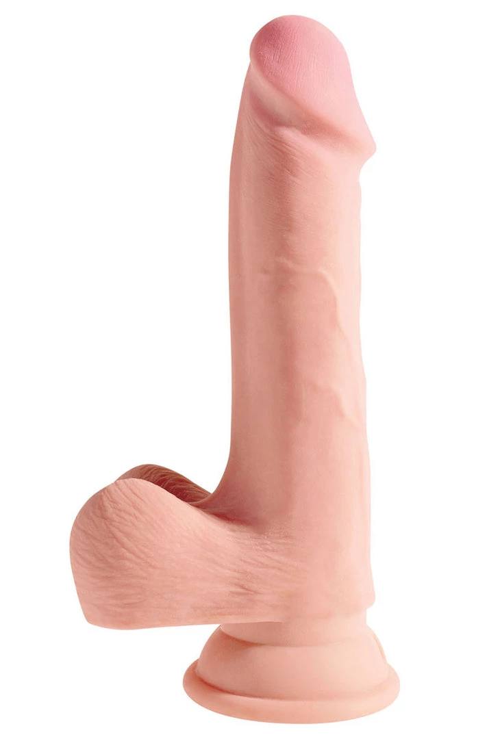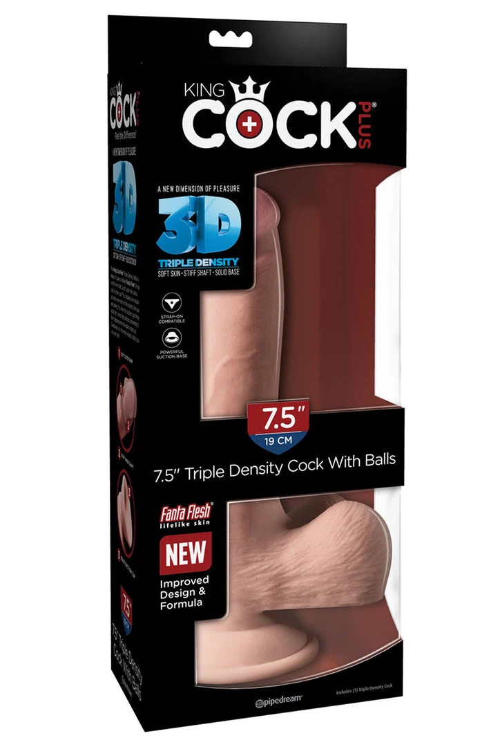 The King Cock Plus Triple Density dildo has a stiff inner shaft, a soft outer skin, realistic texture details and a solid suction cup! The improved design and formula offers superior realism with a soft, lifelike exterior, creating the feel and flexibility of a real penis.