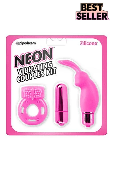 Neon Vibrating Couples Kit in Pink from Pipedreams. Get the party started anytime, anywhere with this incredible Neon Vibrating Couples Kit. Perfect for first timers, this kit features a silicone mini rabbit vibe and a super stretchy vibrating cock ring with a convenient removal bullet. With the push of a button the bunny’s flickering ears tickle and tease sensitive erogenous zones with pinpoint stimulation, while the vibrating cock ring delivers a thrilling buzz for both partners. Phthalate free and body safe, this kit will boost your performance and pleasure.