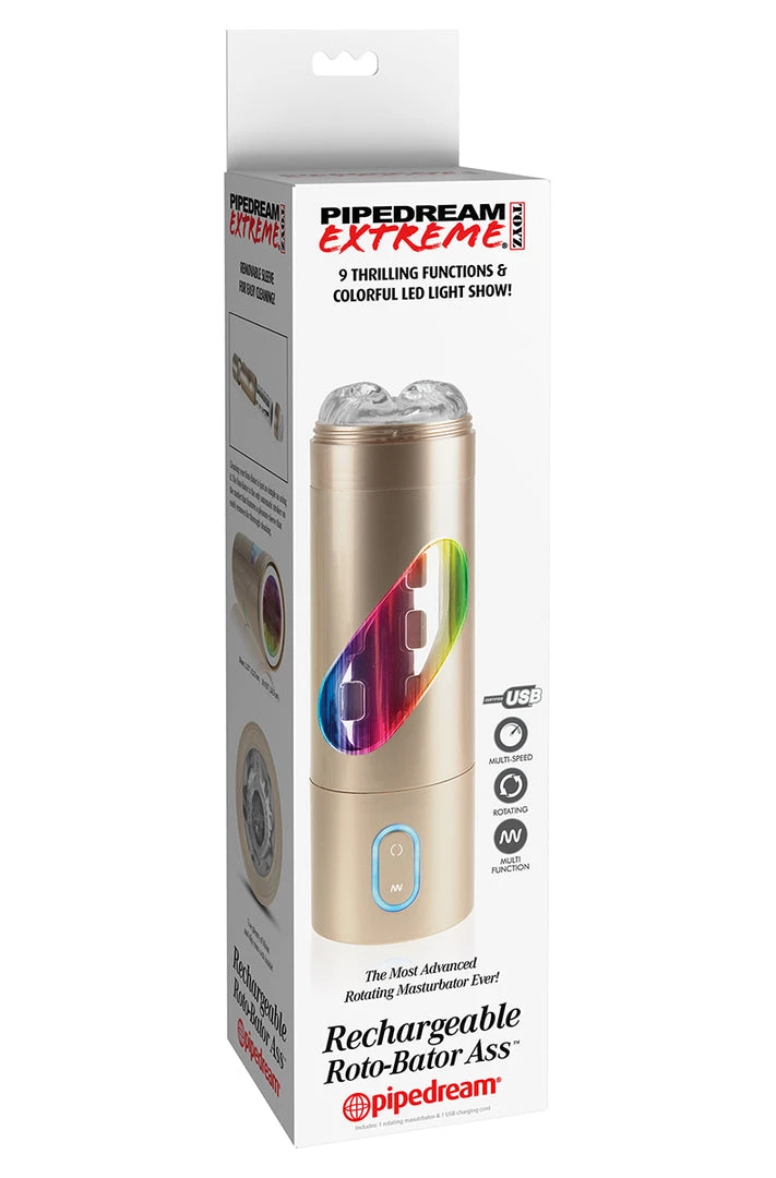 Pipedream Extreme Toyz Rechargeable Roto Bator Ass. Get ready for the most incredible, most intense, most advanced rotating masturbator ever imagined! The Rechargeable Roto Bator is the ultimate turbo powered masturbator that does all of the work for you! No more pumping, stroking, or squeezing, just push a button and enjoy mind blowing stimulation developed to make you cum harder than ever before! Unlike ordinary strokers that barely move up and down, the Roto Bator’s advanced rotation mechanism puts a whole new spin on male masturbation! With each revolution of the soft sleeve, the tight mouth wraps around the sensitive areas of your cock while the tiny ticklers tease and please, delivering spine tingling sensations that are better than the real thing! You get mind-blowing satisfaction when you want it, for as long as you want, without any strings attached! Powered by an ultra strong motor, this full automated masturbator features nine thrilling rotation patterns to choose from. Each pattern has a colorful LED light display that changes color with each movement. The reverse oration button instantly changes direction of the spinning pleasure sleeve, allowing you to experiment with endless pleasure combinations every time you use it. It is engineered like no other masturbator on the market, with independent controls for function and rotation direction. Press the bottom button to power up the Roto Bator and cycle through all nine functions. Press the top button to instantly reverse rotation direction of the sleeve. Hold the power button down for three seconds to turn the device off. To charge your Roto Bator, plug the included USB cord into any USB plug and let it charge for 2 hours. Run time is approximately 1.5 hours per session. The long cylinder and stretchy sleeve can accommodate a wide range of sizes and girths, just be sure to use plenty of Moist Body Lotion when you insert your penis inside the pleasure sleeve.