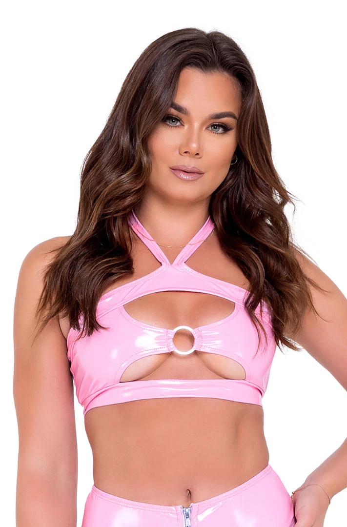 Baby Pink Vinyl Bikini Top has an O ring with keyhole details. Halter ties around the neck. Perfect for any rave or festival.Â