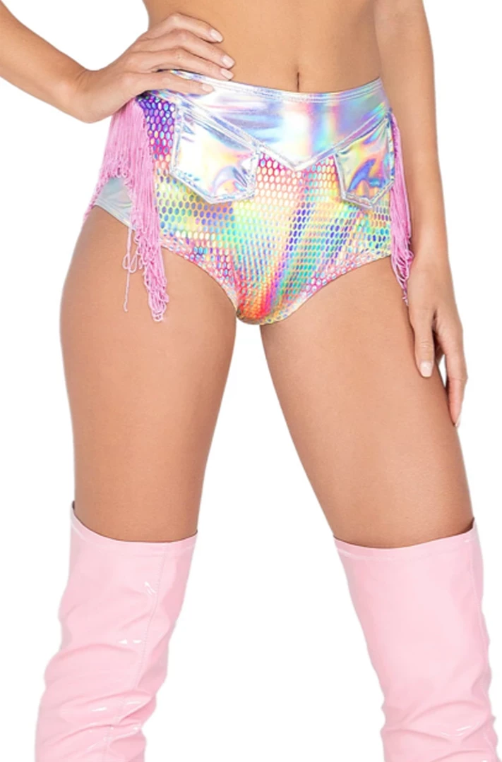 Holo Fringe Shorts mix several holographic fabrics with pink fringe to make a one of a kind look. Faux pockets in the front.