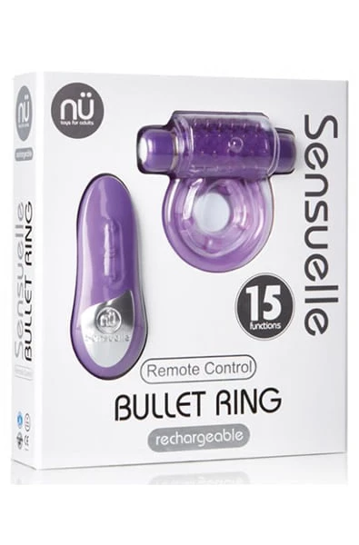 Nu Toys for adults Sensuelle Remote Control Ring Purple features 15 functions. Studded double cock ring. One smooth outer ring and one studded ring and a studded sleeve for stimulation for her. Rechargeable. Remote control. Remote controlled 15 function bullet. USB rechargeable cock ring is amazingly powerful. Discreet and quiet. Includes 15 functions, USB rechargeable bullet. USB rechargeable remote control. Charging time one hour. Run time 40 minutes to 60 minutes. Bullet is made using ABS plastic. Ring is made using Silicone SEBS. Waterproof for play outside the bedroom. 1 year warranty.
