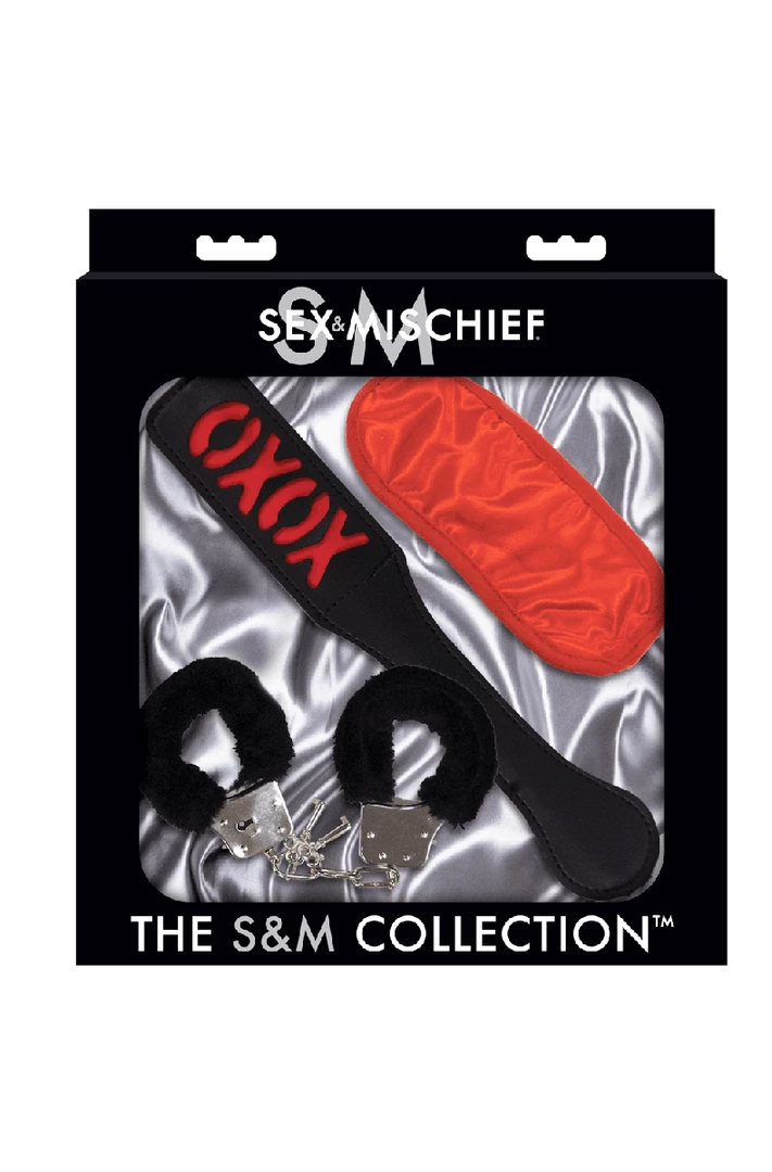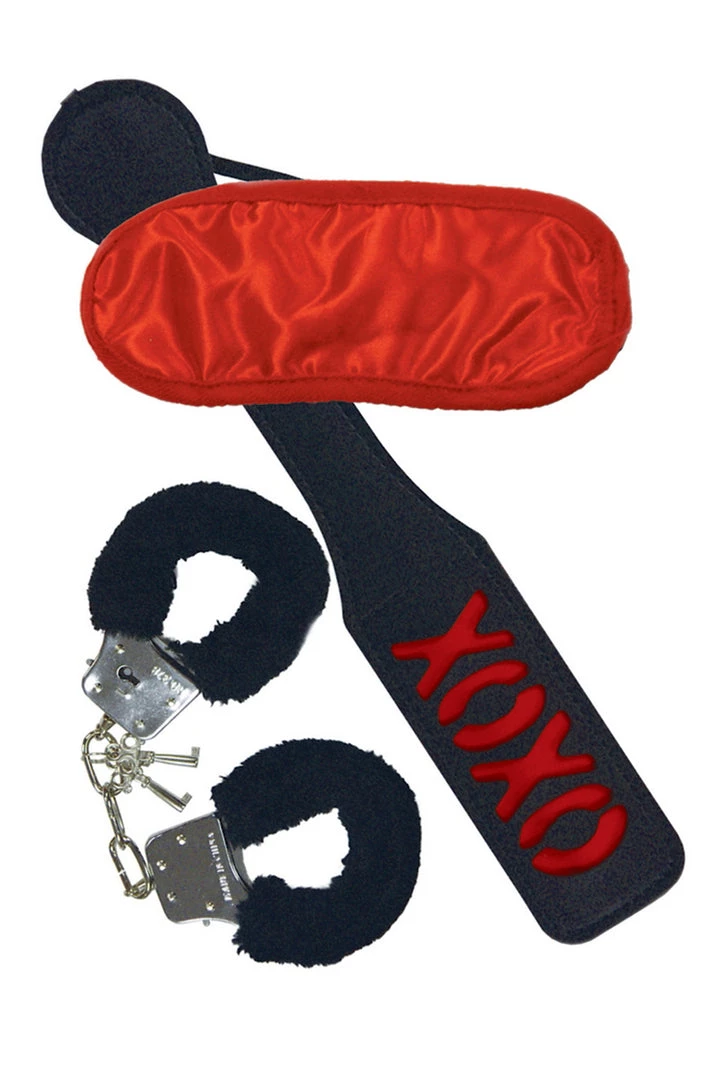 Three piece set includes one blindfold, one impressions black leather XOXO slapper paddle and one pair of furry handcuffs plus release keys. This item makes a great starter set for loving couples.