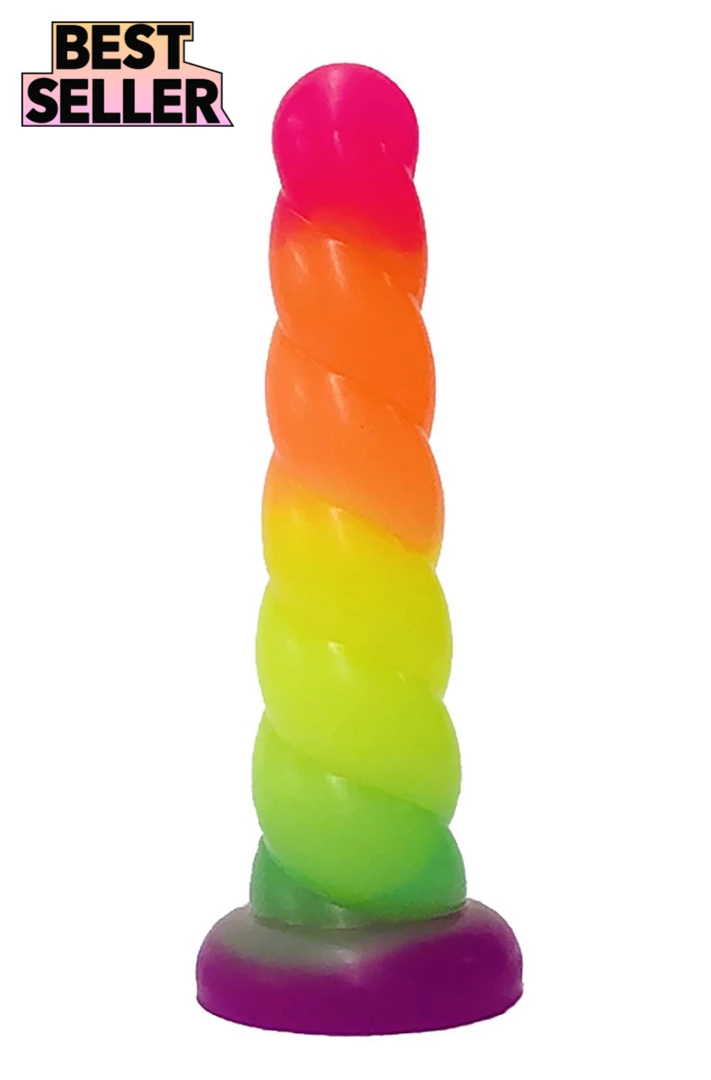The vibrant rainbow unicorn is that mystical creature that only exist in your dreams and if you blink you might miss her. Her beauty is indescribable. Just a look at her and you might scream in ecstasy. We went off into the deepest darkest works to spot this creature and steal her horn. The vibrant rainbow unicorn dildo is that piece of your unfilled fantasy that have come out to play scream at you from your bedside drawer. Use the unicorn dildo alone or in a strap on of your choice. Its flat base makes it easy to ride all night long. Lots of twist for extra riding enjoyment.Â