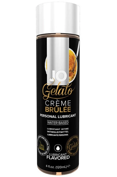 System JO Gelato Personal Lubricant Water Based Creme Brulee 4 fluid ounces. Gelato is a flavored water based personal lubricant designed to enhance foreplay and comfort of intimacy. Formulated using a pure place sourced glycerin, this product provides a comfortable glide using quality ingredients. Each flavor profile is created around a base that is sugar, paraben and propylene glycol free for a gentle glide that is never sticky or tacky and has no after taste. Sugar free, safe for vaginal use. A must have for romantic getaways and anniversaries. Made in the USA